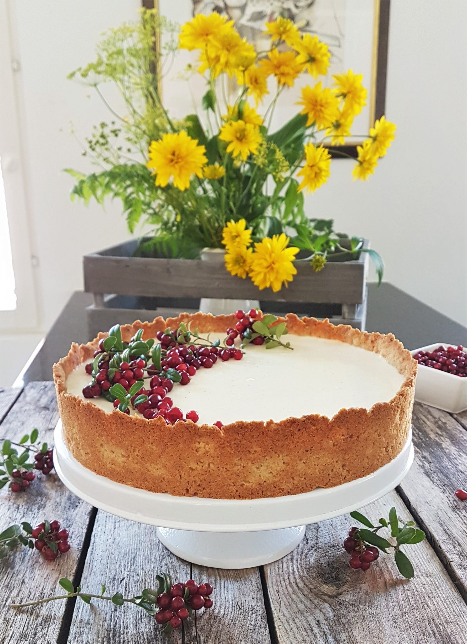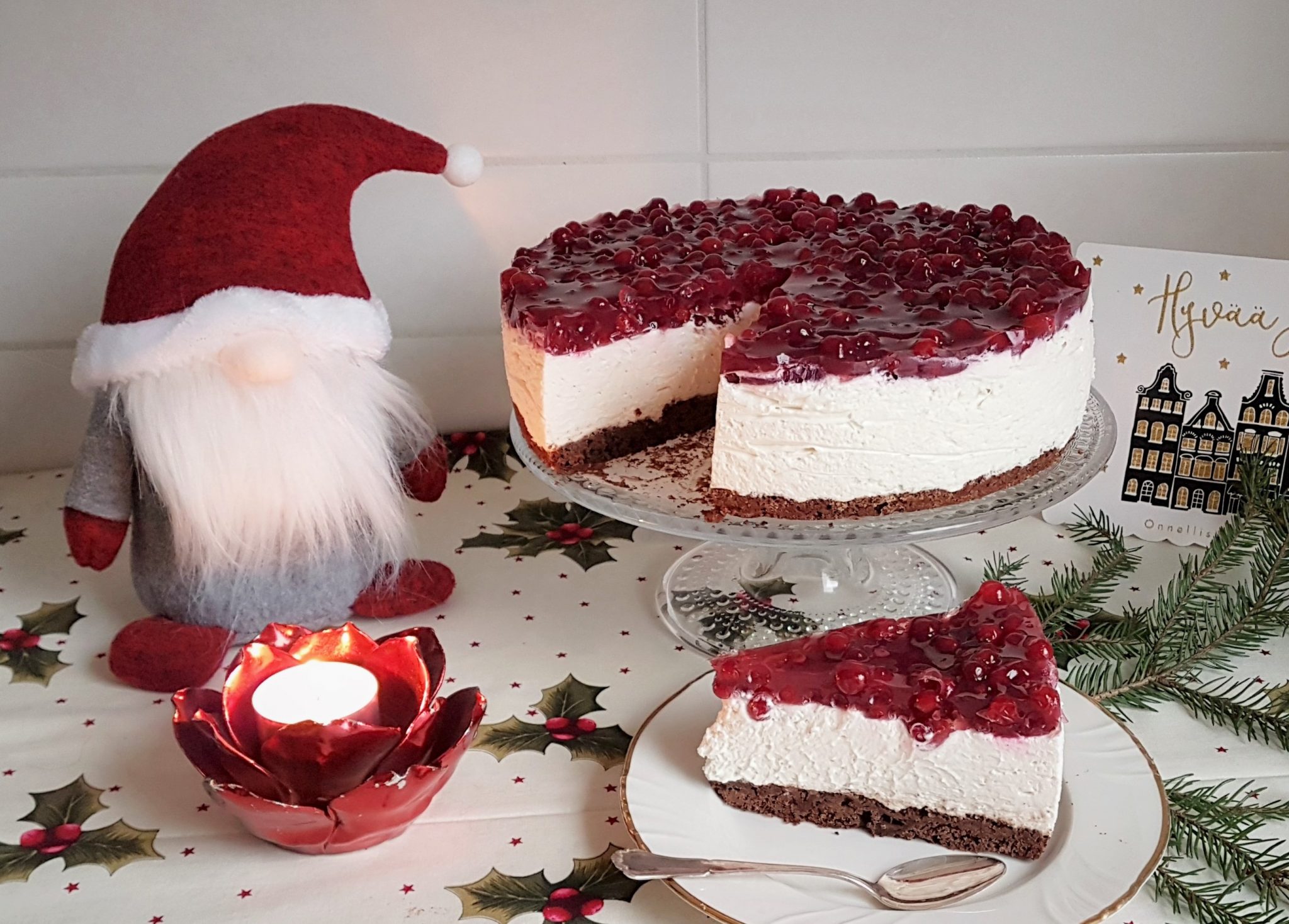 Viimeisenä, mutta ei suinkaan vähäisempänä, on ihana gluteeniton ja vegaaninen puolukka-valkosuklaajuustokakku. Kakun brownie-pohja on mielettömän hyvää ja suklaista. Pohja valmistuu riisijauhoista ja mantelijauheesta. Juustokakkumassa hyydytetään agar agar hyytelöimisjauheella. Kakun voi tehdä hyvissä ajoin valmiiksi, maku vaan paranee.