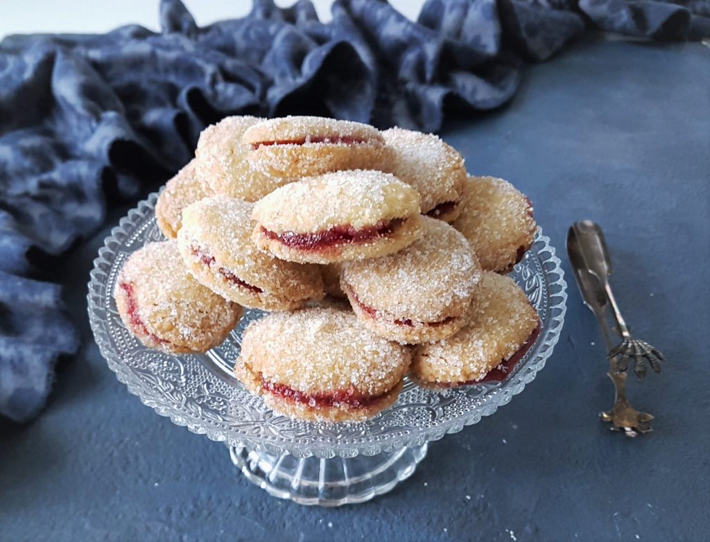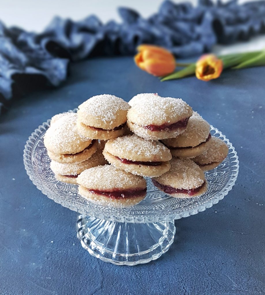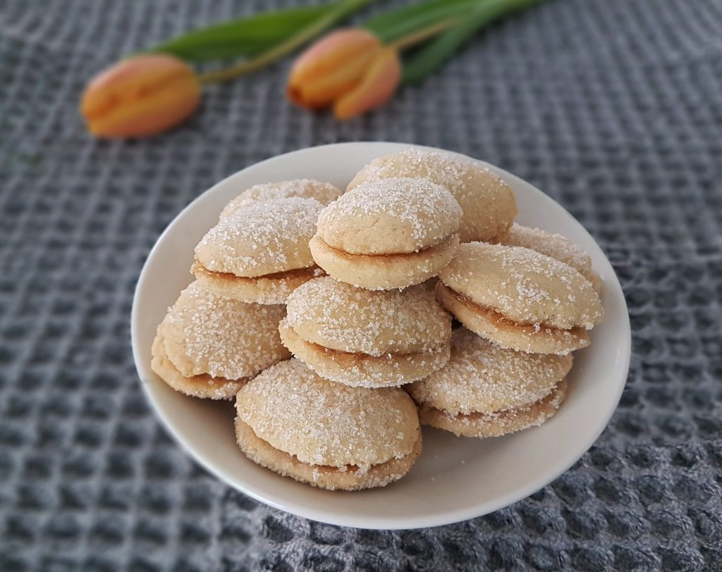 Levitä marmeladia joka toisen pikkuleivän tasaiselle pinnalle ja paina toinen pikkuleipä päälle.