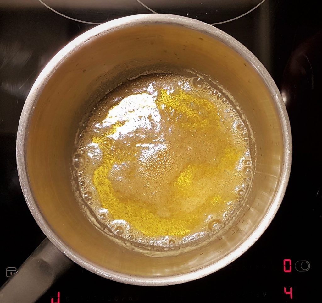 Sulata voi teräskattilassa ja kiehauta. Anna voin hiljalleen poreilla useita minuutteja välillä sekoittaen, kunnes voi alkaa punertua.