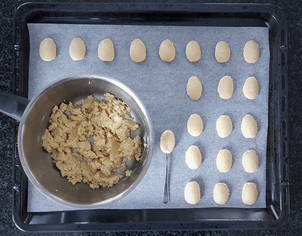 Painele taikinaa soikean ja mielellään melko syvän teelusikan pesään. Tasoita pinta ja siisti reunat. Vedä taikina lusikasta suoraan leivinpaperille tasainen pinta alaspäin.