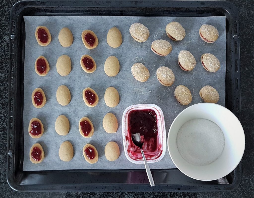 Lusikkaleivät ovat hauraita, joten anna niiden jäähtyä pellillä uunista ottamisen jälkeen. Joka toiselle jäähtyneelle pikkuleivälle levitetään marmeladia ja toiset pikkuleivät asetetaan päälle. Lusikkaleivät kieritellään lopuksi sokerissa.