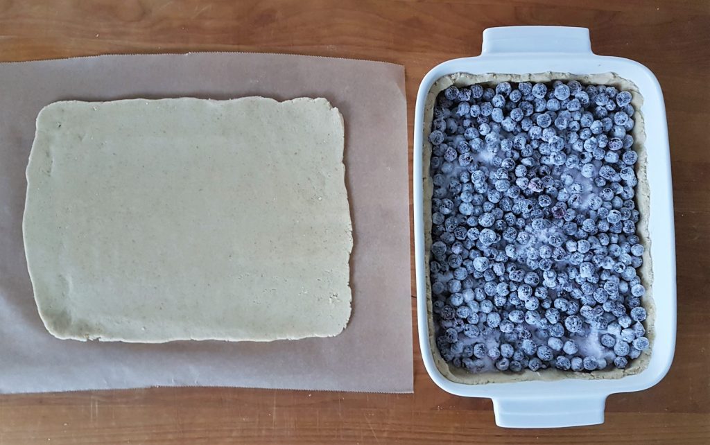 Tein mustikkakukon taikinan gluteenittomasta kaurapohjaisesta jauhoseoksesta, jossa on psylliumia. Taikinasta 2/3 painelin vuoan pohjalle ja reunoille. Lopusta taikinasta kaulin kannen. Psylliumin ansiosta kansi oli helppo kaulita ja siirtää mustikkaseoksen päälle. Jos teet pohjan tattarijauhoista, laita taikina kylmään ennen kansiosan kaulitsemista. Voit myös laittaa taikinan nokareina mustikkaseoksen päälle.