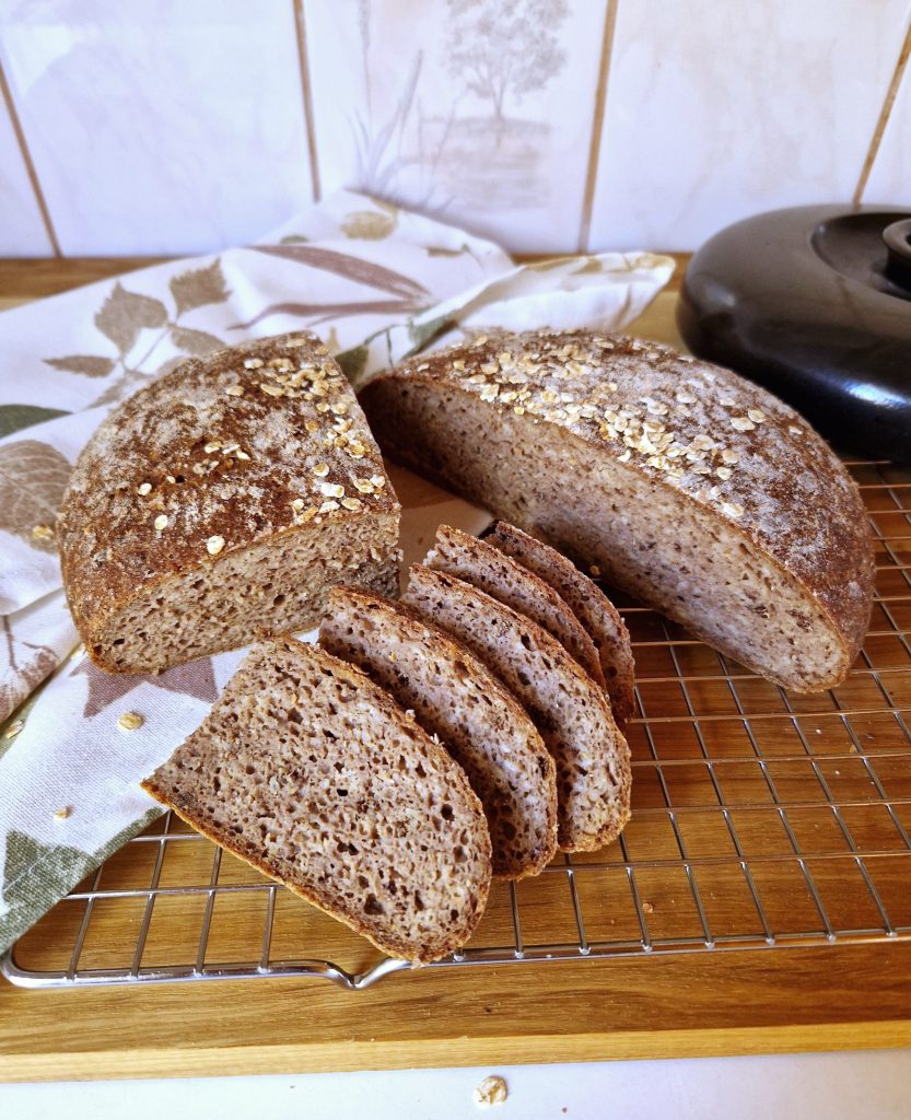 Gluteeniton tumma pataleipä onnistui erinomaisesti. Leipä on tosi maukasta, rakenne oikein hyvä ja mikä parasta – leipä säilyy tuoreena useamman päivän. Ei arvaisi, että se on gluteenitonta. Tämän parempaa tummaa gluteenitonta pataleipää saa kyllä hakea. Leipä onnistuu myös kattilassa tehtynä ja eri tavalla kohotettuna. Kaikki toimi mainiosti. Yhtä hyvää pataleipää joka kerta. Katso nopeampi tapa leipoa pataleipää valmistusohjeen lopusta.