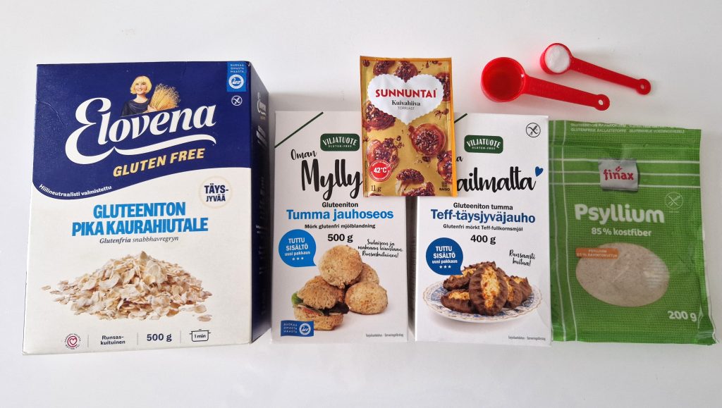 Tummaan gluteenittomaan pataleipään laitoin viljavalmisteina kolmea raaka-ainetta: Virtasalmen viljatuotteen tummaa gluteenitonta jauhoseosta ja teff-täysjyväjauhoa sekä gluteenittomia kaurahiutaleita. Jos kaura ei sovi, tattarihiutaleetkin käyvät. Lisäksi tarvitset kylmää vettä, suolaa, psylliumia ja kuivahiivaa. Yksinkertaiset aineet.