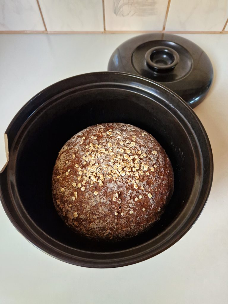 Tummaa pataleipää paistetaan kannen alla ensin 35 minuuttia. Tämän jälkeen kansi nostetaan pois päältä ja lämpötila säädetään 250 asteeseen. Leipää paistetaan vielä 25 minuuttia.
