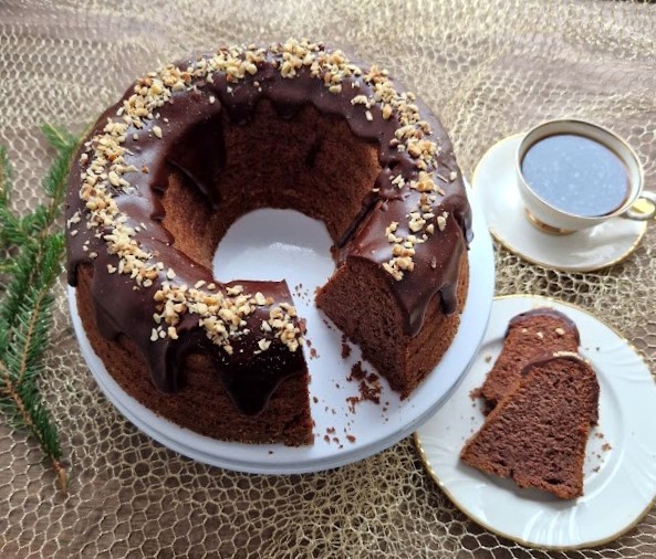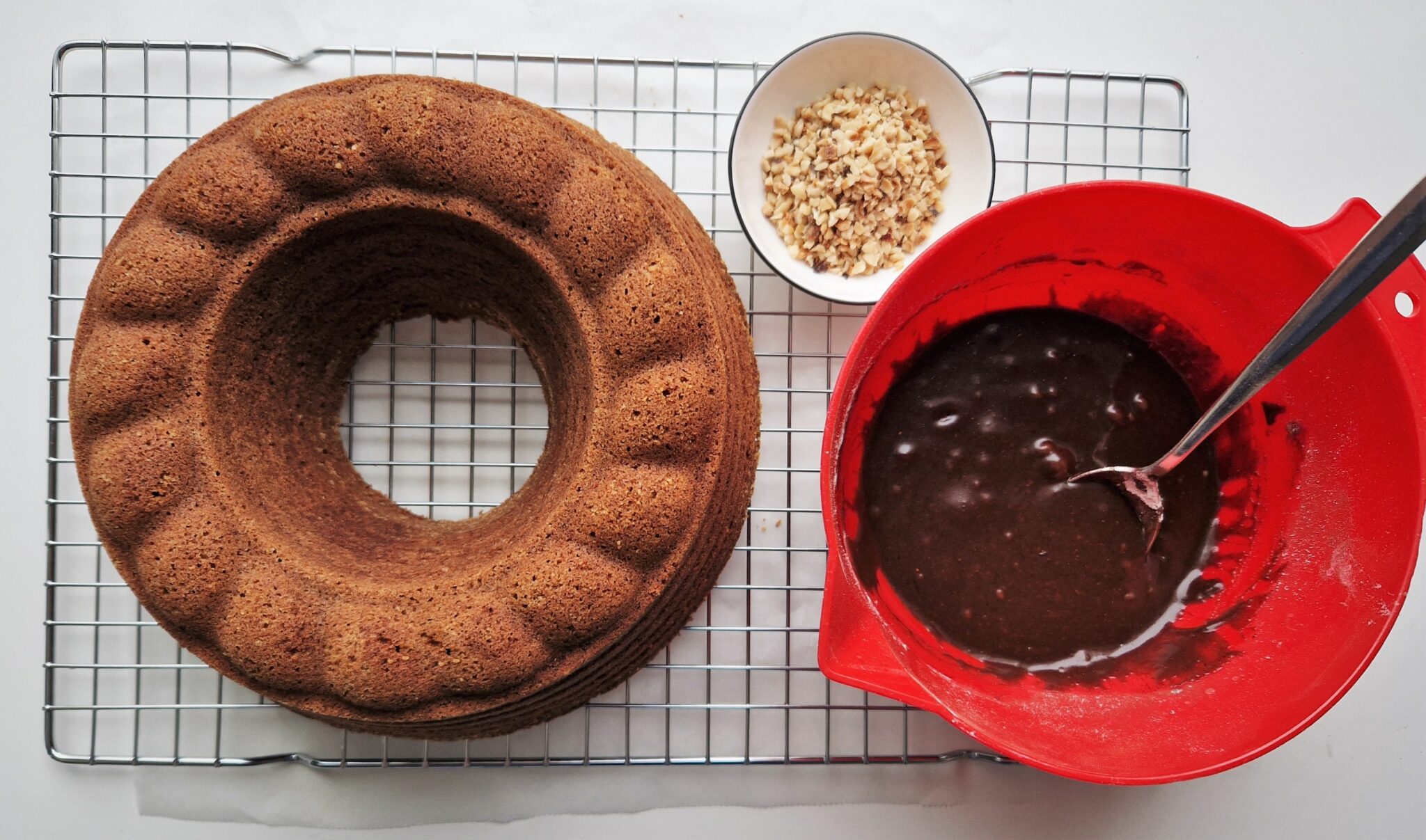 Kuorrutus tehdään voista, tomusokerista ja kaakaojauheesta ja notkistetaan vahvalla kahvilla. Mausteiksi laitoin kanelia ja vaniljasokeria. Kuorrutuksen voi pursottaa pussin avulla tai valuttaa lusikalla. Voit halutessasi kuorruttaa koko kakun. Tee silloin kuorrutusta 1½-kertainen annos.