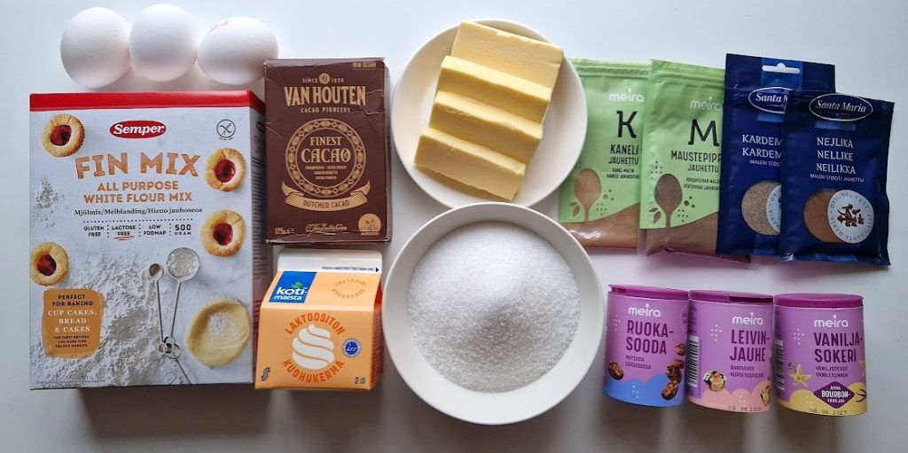 Leivoin gluteenittoman arabialaisen maustekakun Semperin hienolla jauhoseoksella. Kakussa saa olla reilusti jouluisia mausteita kuten kanelia, kardemummaa ja neilikkaa. Maustepippuri myös kuuluu arabialaiseen maustekakkuun. Lisäksi voit laittaa ripauksen suolaa, jos haluat. Suola korostaa mausteiden makua. Kerman lisäsin vuorotellen jauhoseoksen kanssa.