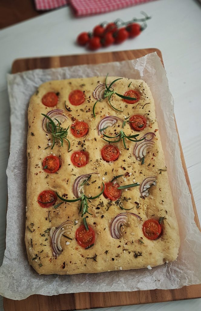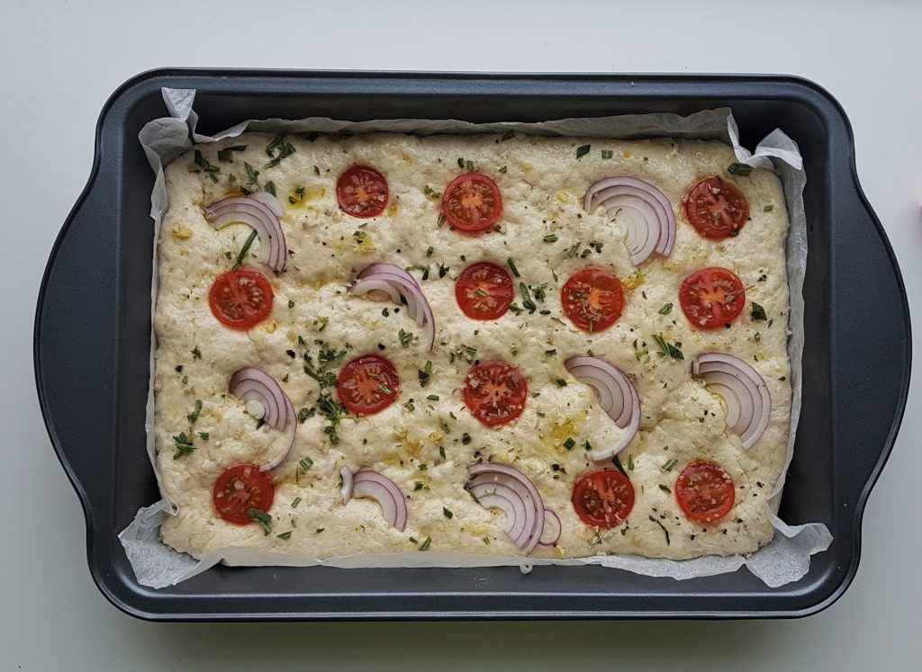 Taikinaan painellaan etusormella koloja ja päälle sivellään reilusti hyvälaatuista oliiviöljyä. Paistettaessa oliiviöljy tekee leivän pinnan rapeaksi ja maukkaaksi. Lisäsin oliiviöljyn sekaan hienonnettua valkosipulia. Koloihin painelin kirsikkatomaatin puolikkaita ja punasipulia. Pinnalle ripottelin yrttimerisuolaa, sormisuolaa ja tuoretta rosmariinia. Sitten eiku uuniin.