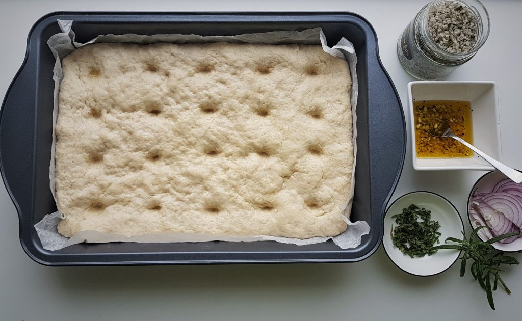 Focacciataikina taputellaan pieneen vuokaan tai pellille noin 20 cm x 30 cm kokoiseksi levyksi. Parhaiten se käy öljytyin käsin. Leipää kohotetaan kaksinkertaiseksi noin 40-50 minuuttia. Pitkä kohotus takaa kuohkean rakenteen.