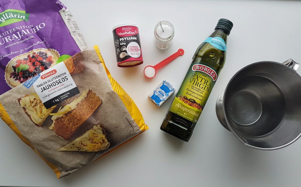 Leivoin myös focacciaa, joka on litteä italialainen leipä. Gluteeniton focaccia on helppo ja nopea valmistaa ja sitä voi varioida oman maun mukaiseksi. Focaccian taikinaan tulee vettä, hiivaa, psylliumia, Pirkan gluteenitonta vaaleaa jauhoseosta, ripaus sokeria ja suolaa sekä oliiviöljyä. Korvasin osan gluteenittomasta jauhoseoksesta kaurajauholla. Kaura tuo makua ja kuitua leipään.