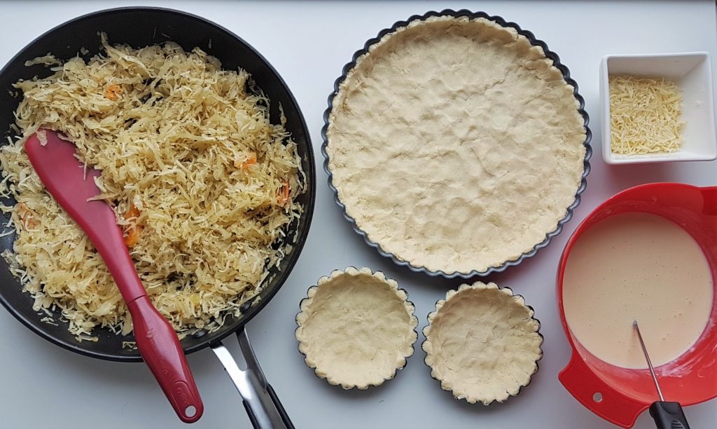 Lisää hieman jäähtyneeseen hapankaaliseokseen puolet juustoraasteesta ja levitä seos piirakkapohjalle.