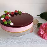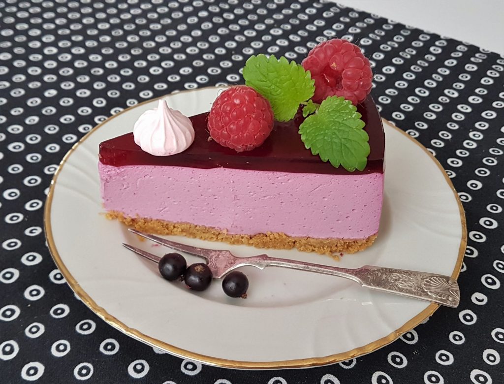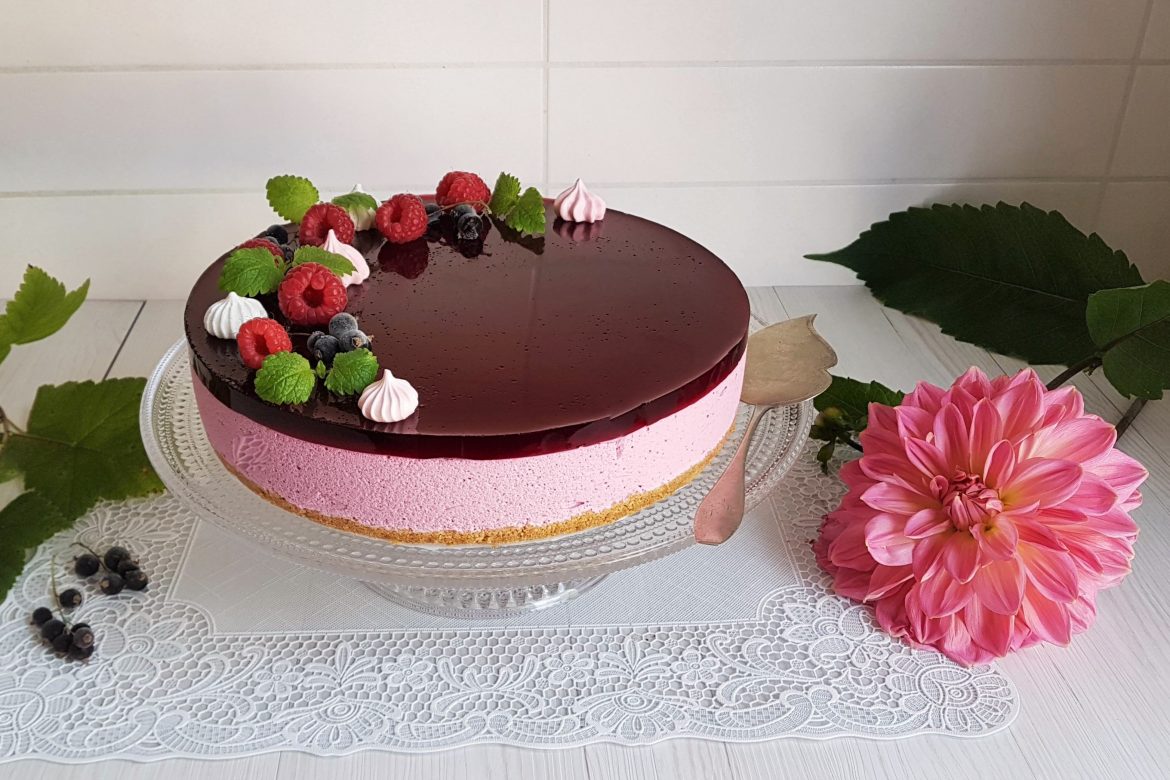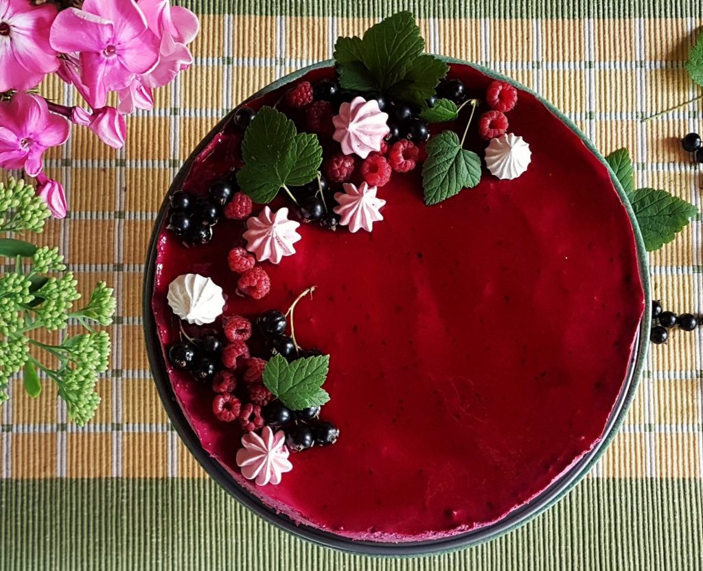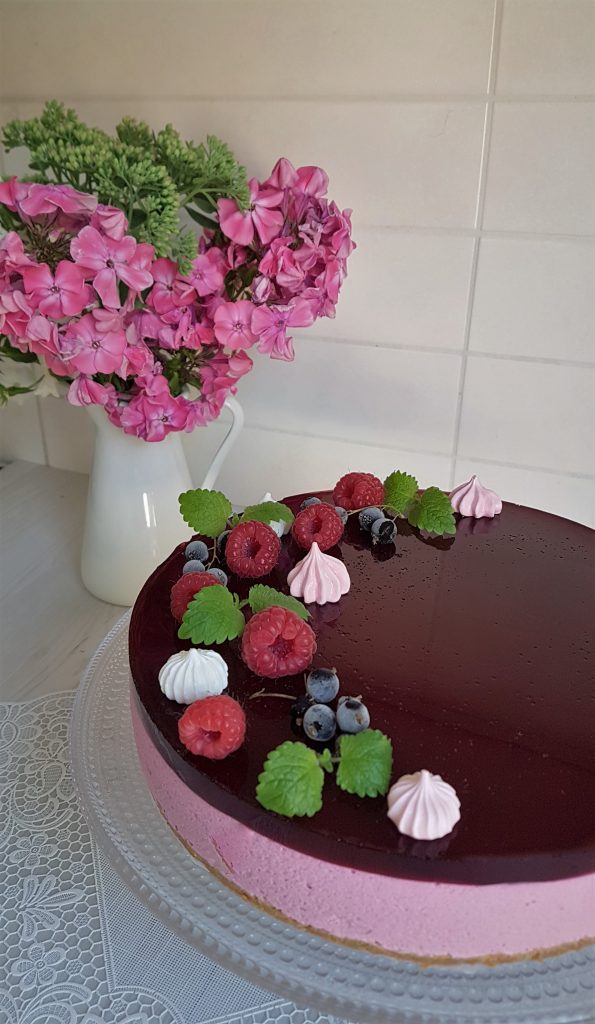 Irrota kakku vuoasta ja siirrä se kakkuvadille. Koristele kakku mustaherukoilla, marengeilla tai kermavaahtoruusukkeilla.