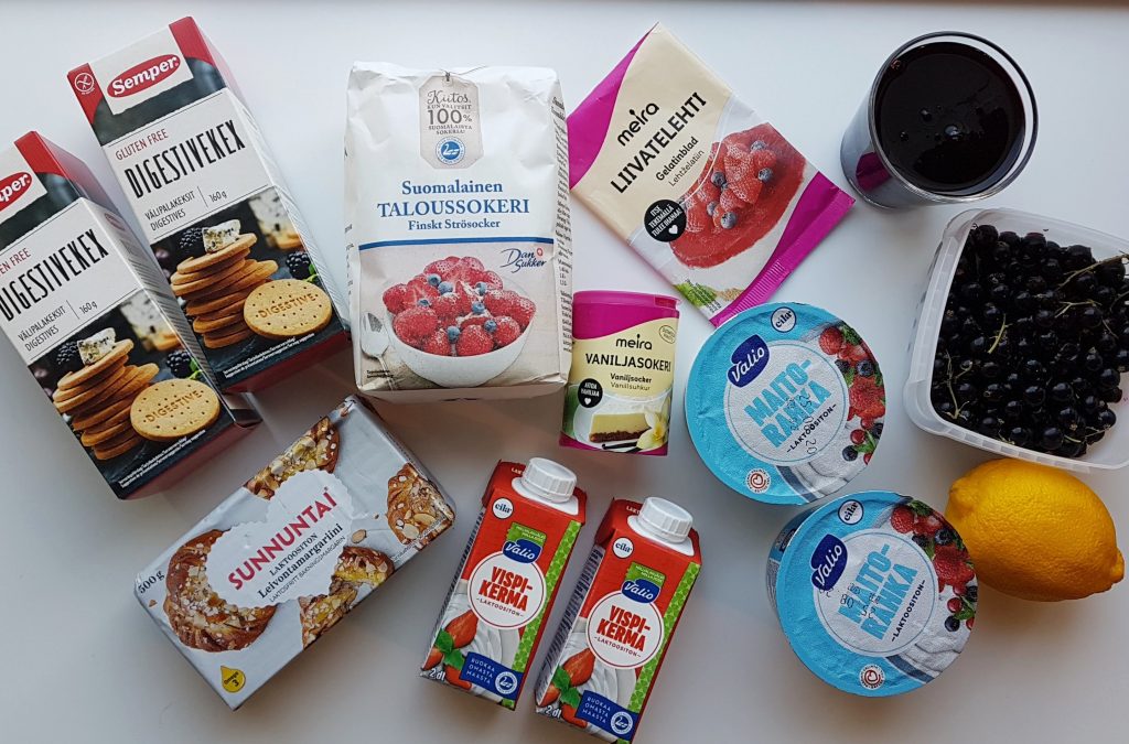Tähän mustaherukkakakkuun käytin täytteeksi maitorahkaa ja kermaa. Mustaherukat kiehautin pienessä vesimäärässä ja painelin massan siivilän läpi kastikkeeksi. Kastiketta olisi hyvä olla 2 dl. Jos määrä jää vajaaksi, lisää joukkoon mustaherukan mehua. Voit myös soseuttaa mustaherukat monitoimikoneessa ja lisätä soseen kuorineen, saat vahvemman aromin kakkuun. Tällöin sokerin määrää voi vähän lisätä. Kiille kakun päälle kannattaa tehdä liivatteesta, onnistuu parhaiten.