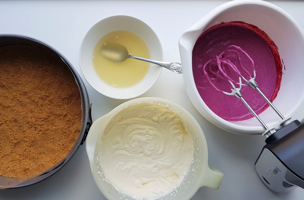Valmista kakun pohja. Jauha keksit monitoimikoneella hienoksi tai laita keksit muovipussiin ja murskaa kaulimen avulla. Sekoita keksimurujen joukkoon sulatettu margariini.
