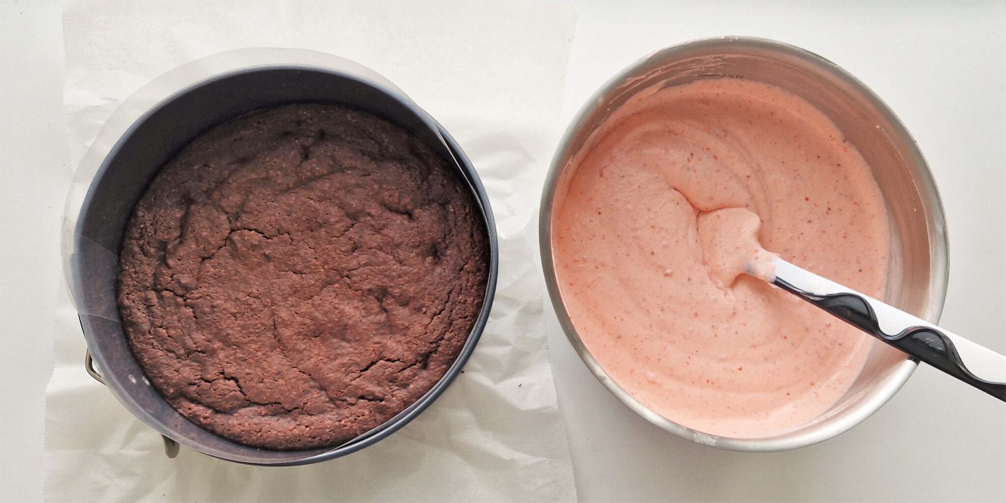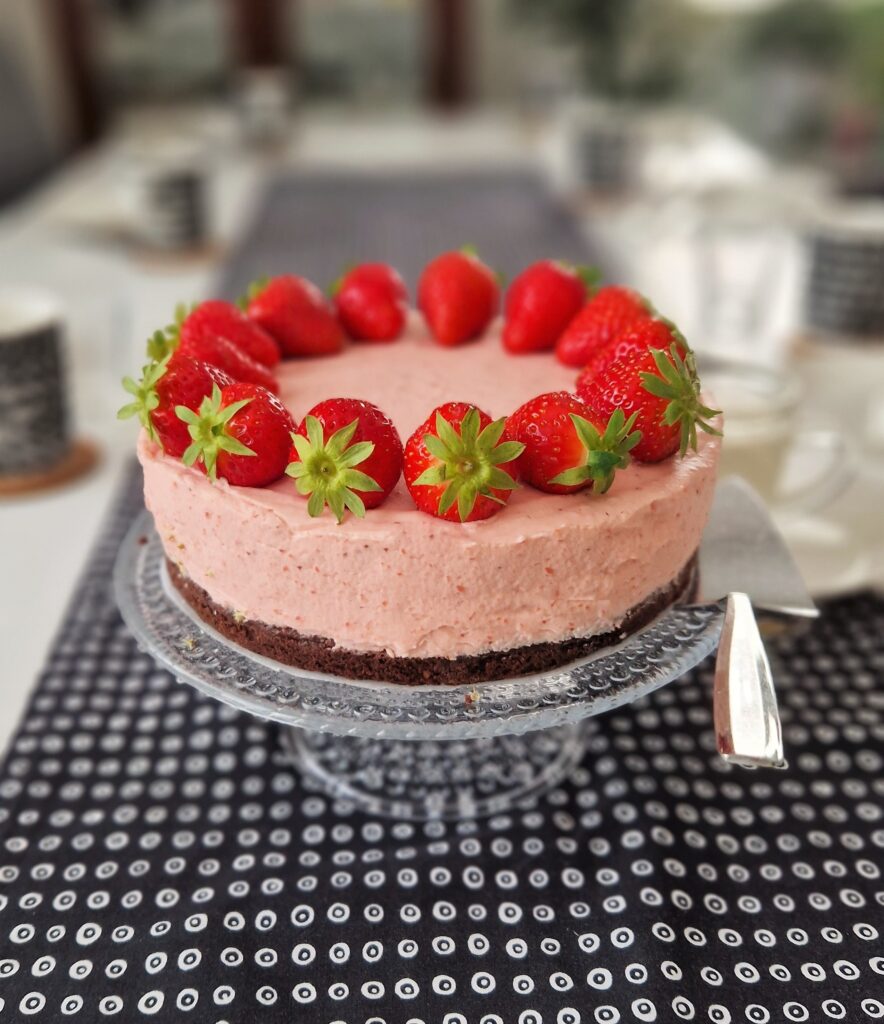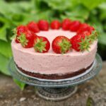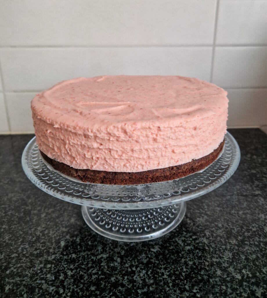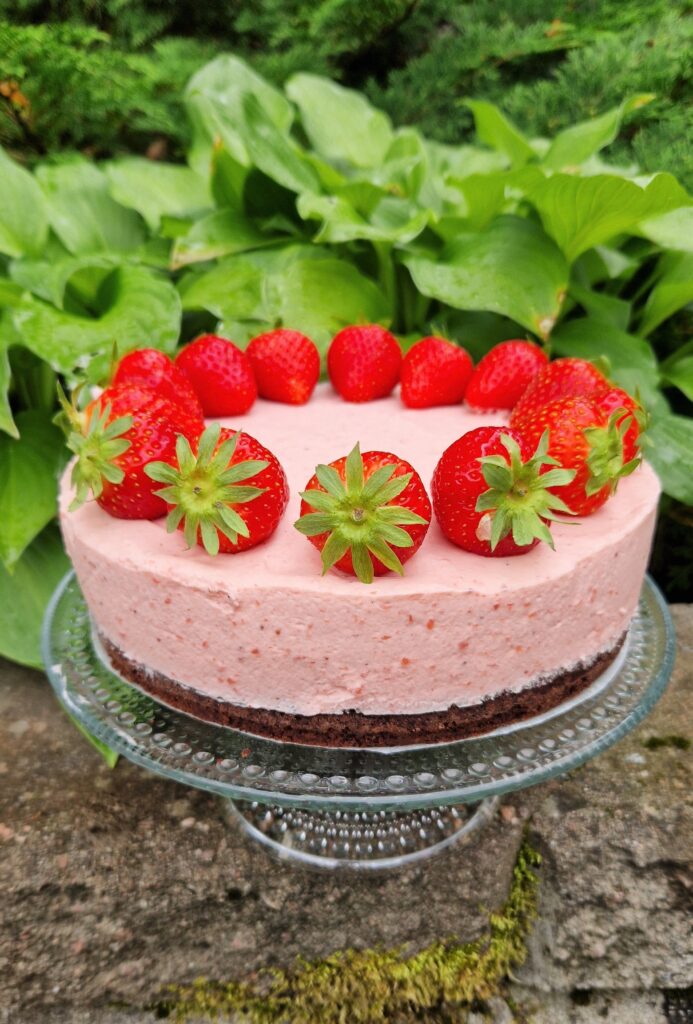 Gluteeniton ja vegaaninen mansikkamoussekakku browniepohjalla