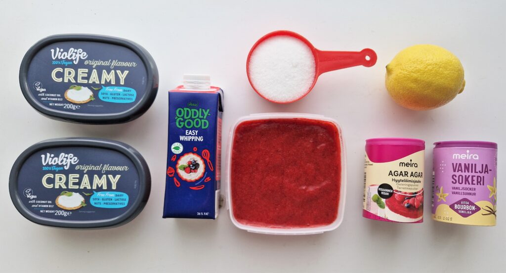 Mansikkamoussetäytteeseen testasin Valion Oddly Good Easy wipping -kasvivispiä sekä Violifen vegaanista tuorejuustoa. Molemmat ovat myös gluteenittomia. Oddly Goodin vispistä saa napakan vaahdon, joka sopii myös pursotukseen. Aikaisempaan mansikkamoussekakkuun laitoin lisäksi vegaanista valkosuklaata, mutta tällä kertaa halusin tehdä vähän kevyemmän version.