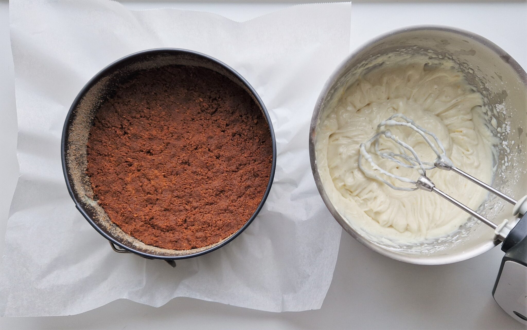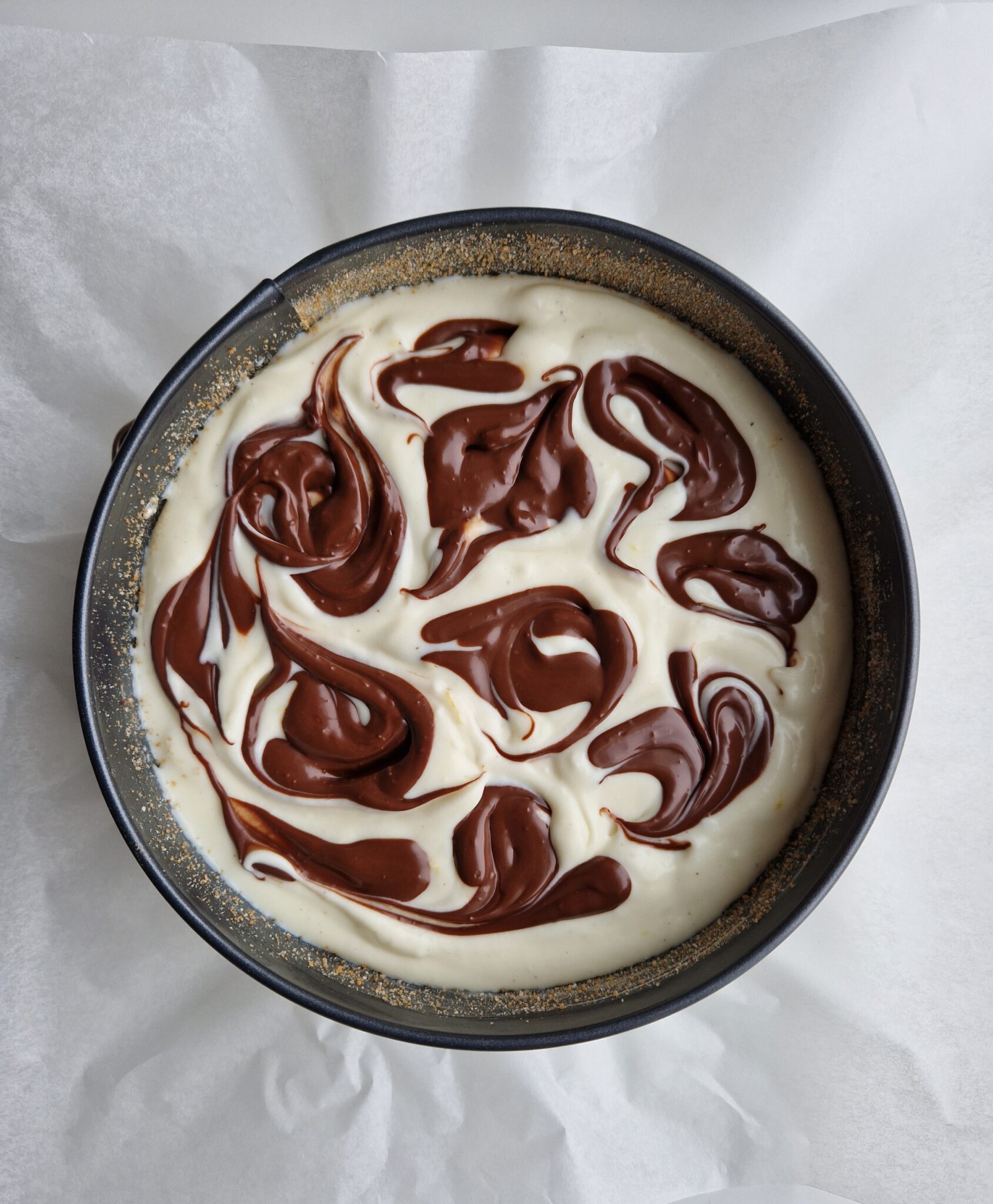 Valmista pohja. Murskaa keksit joko monitoimikoneessa tai kaulimella. Sulata margariini. Sekoita keksimurska ja sulatettu margariini ja hasselpähkinä-suklaalevite keskenään. Painele seos irtopohjavuoan pohjalle. Siirrä vuoka jääkaappiin täytteen valmistamisen ajaksi.