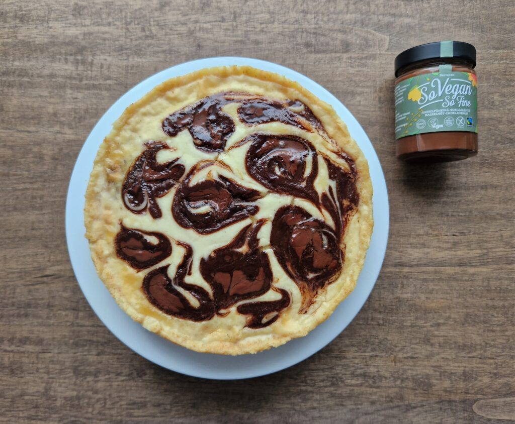 Tällä ohjeella voit valmistaa gluteenittoman ja vegaanisen paistetun juustokakun, kun jätät hasselpähkinä-suklaalevitteen pois päältä. Voit koristella juustokakun tuoreilla marjoilla tai hedelmillä tai nauttia marjakastikkeen kera.