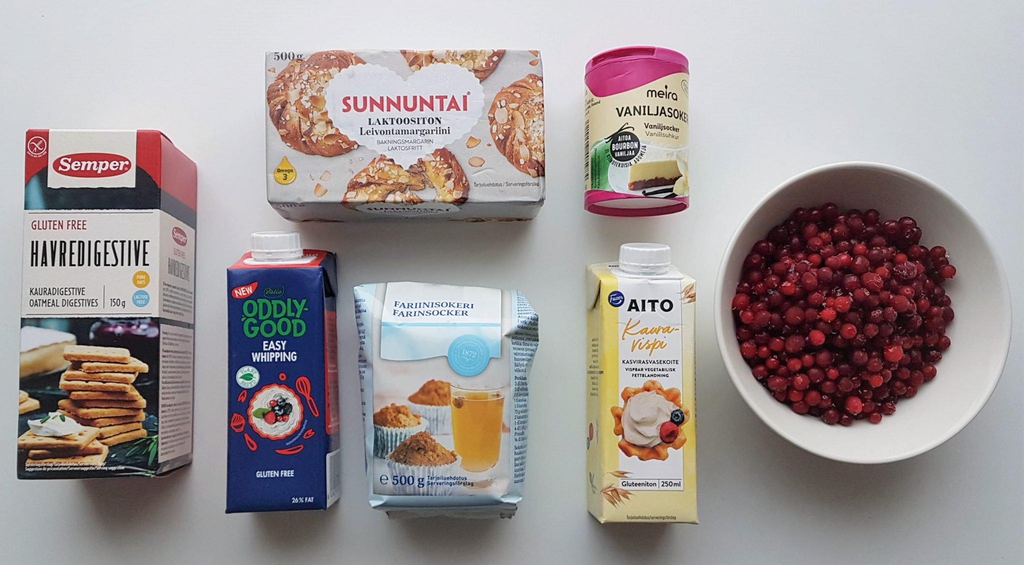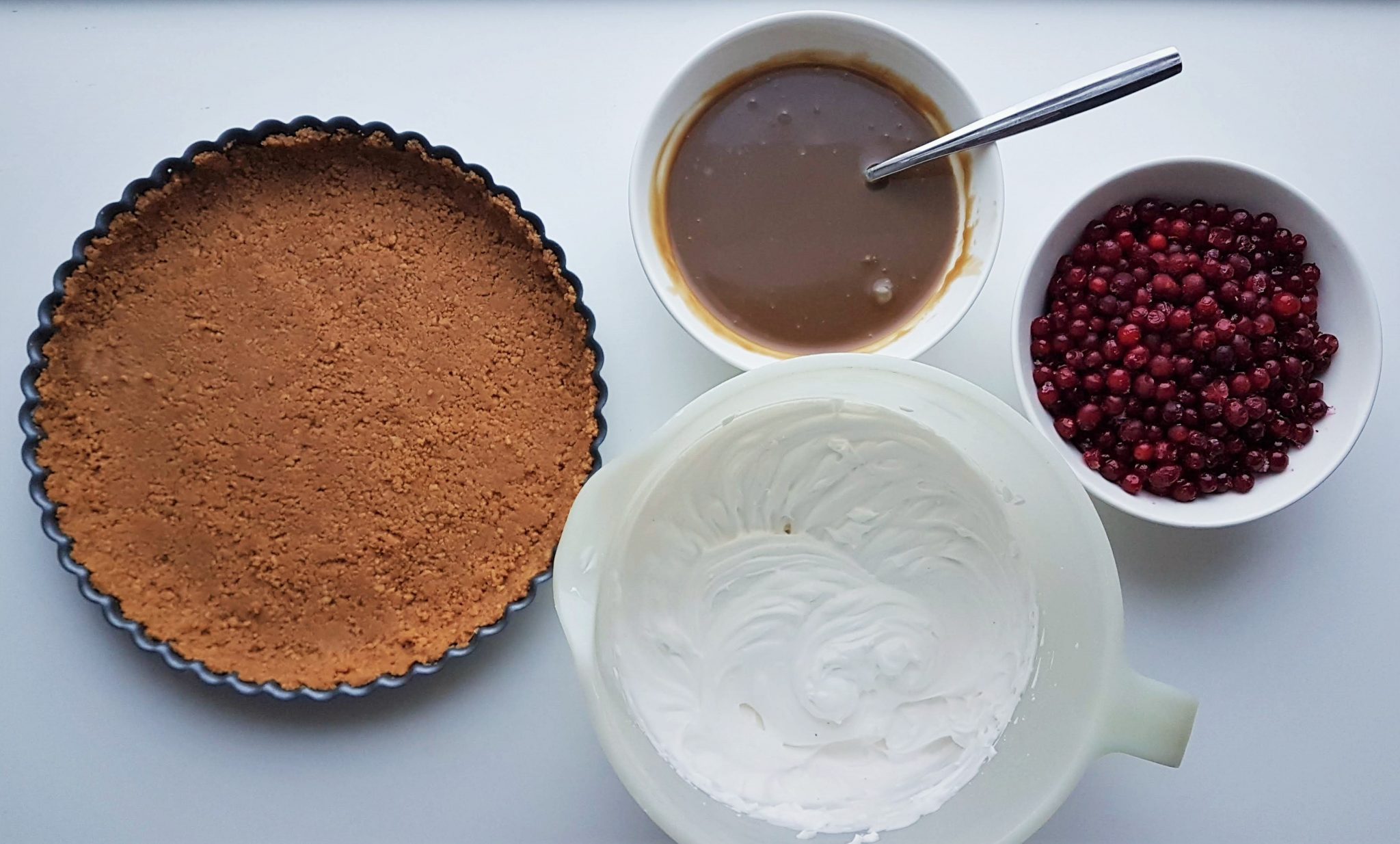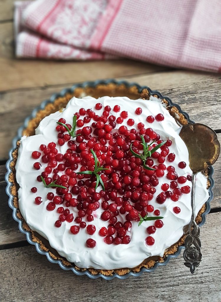 Jos et tarvitset tehdä vegaanista versiota, levitä muruseokselle purkillinen karamellisoitua kondensoitua maitoa sekä päälle 2 dl vatkattua kuohukermaa. Koristele puolukoilla ja nauti. Nopea herkku!