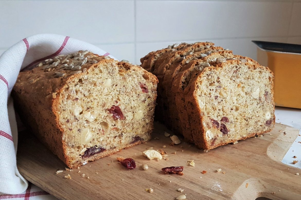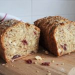 Gluteenittomasta karpalo-pähkinäleivästä tuli mehevä ja maukas. Kuivattu karpalo tuo mukavasti makeutta leipään. Pähkinät ja siemenet lisäävät leivän kuitupitoisuutta ja niitä on kiva rouskutella. Tämä leipä säilyy hyvänä useamman päivän ajan.