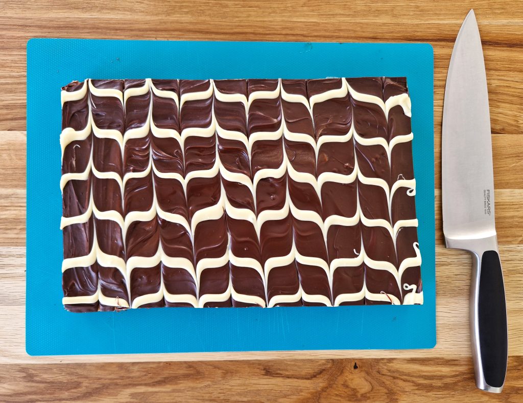 Gluteeniton kinderpiirakka kuorrutetaan sulatetulla gluteenittomalla tummalla suklaalla. Marmorointi tehdään sulatetulla valkosuklaalla.