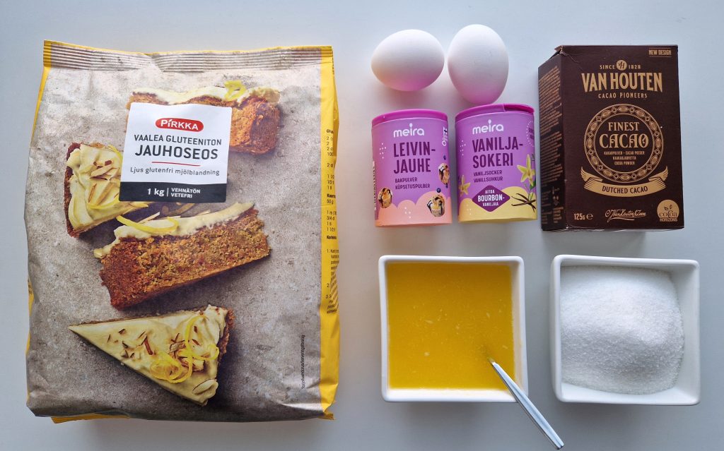Kinderpiirakassa ensin leivotaan gluteeniton suklaakakkupohja. Jäähtyneen pohjan päälle valmistetaan voikreemi. Lopuksi voikreemin pinta kuorrutetaan tummalla suklaalla ja valkosuklaalla sekä marmoroidaan kauniiksi. Suklaakakkupohjaan laitoin Pirkan vaaleaa gluteenitonta jauhoseosta. Pohja oli tosi helppo tehdä. Kuivat aineet sekoitetaan keskenään, joukkoon lisätään sulatettu voi ja kiehuva vesi sekä viimeisenä munat yksitellen. Sekoittamiseen riittää puuhaarukka ja viimeistelyyn nuolija.