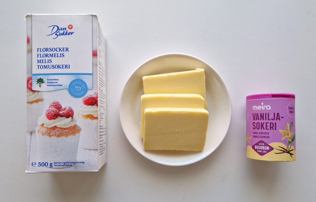 Voikreemitäytteeseen tulee voita, tomusokeria ja vaniljasokeria. Tein vähän normaalia isomman annoksen, sillä minusta täyte on piirakassa parasta. Pehmeää voita vatkataan vaahdoksi useampi minuutti. Tomusokeri lisätään vähän kerrallaan ja vatkataan, kunnes kreemi on vaaleaa ja kuohkeaa. Kreemi maustetaan vaniljasokerilla.