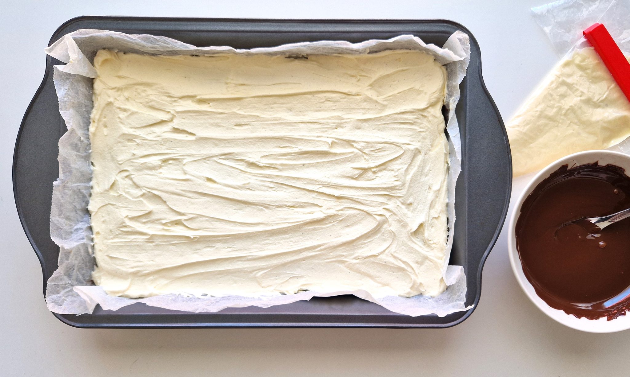 Kaada tumma suklaa täytteen päälle ja levitä suklaa nopeasti lusikan tai palettiveitsen avulla.