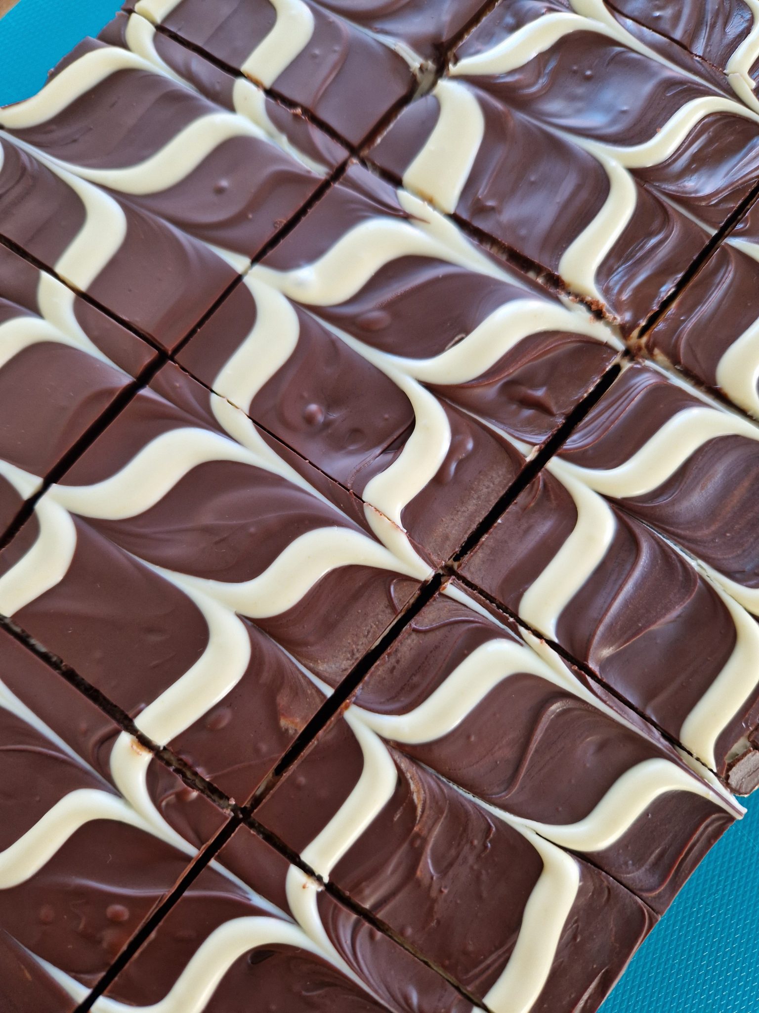Valkosuklaata valutetaan vaakasuoraan raidoiksi tumman suklaan pinnalle. Sitten välittömästi puisella coktail- tai hammastikulla vedetään pystysuoraan edestakaisin, jolloin saadaan kaunis marmorikuvio. Kopauta vuokaa pari kertaa pöydän pintaan, jolloin marmorointijälki asettuu kauniiksi.