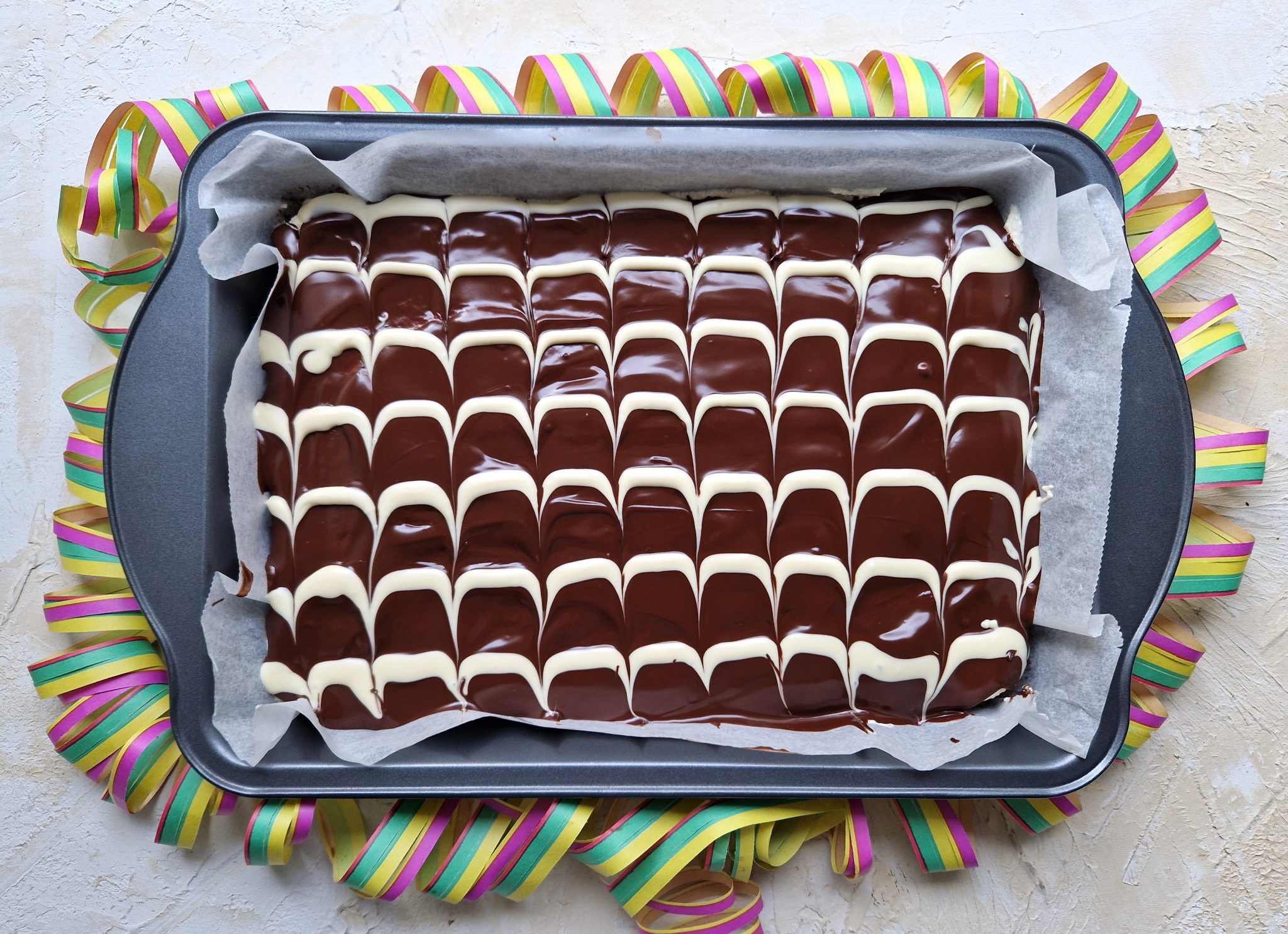 Leikkaa valkosuklaapussin kulmaan pieni aukko ja valuta valkosuklaata raidoiksi vaakatasoon tumman suklaan päälle. Marmoroi pinta vetämällä puisella tikulla (hammastikku tai coktailtikku) pystysuuntaan edestakaisin vedoin (ylös-alas). Kopauta vuokaa pari kertaa pöydän pintaan, jolloin marmorointi tasoittuu kauniiksi. Laita piirakka jääkaappiin.