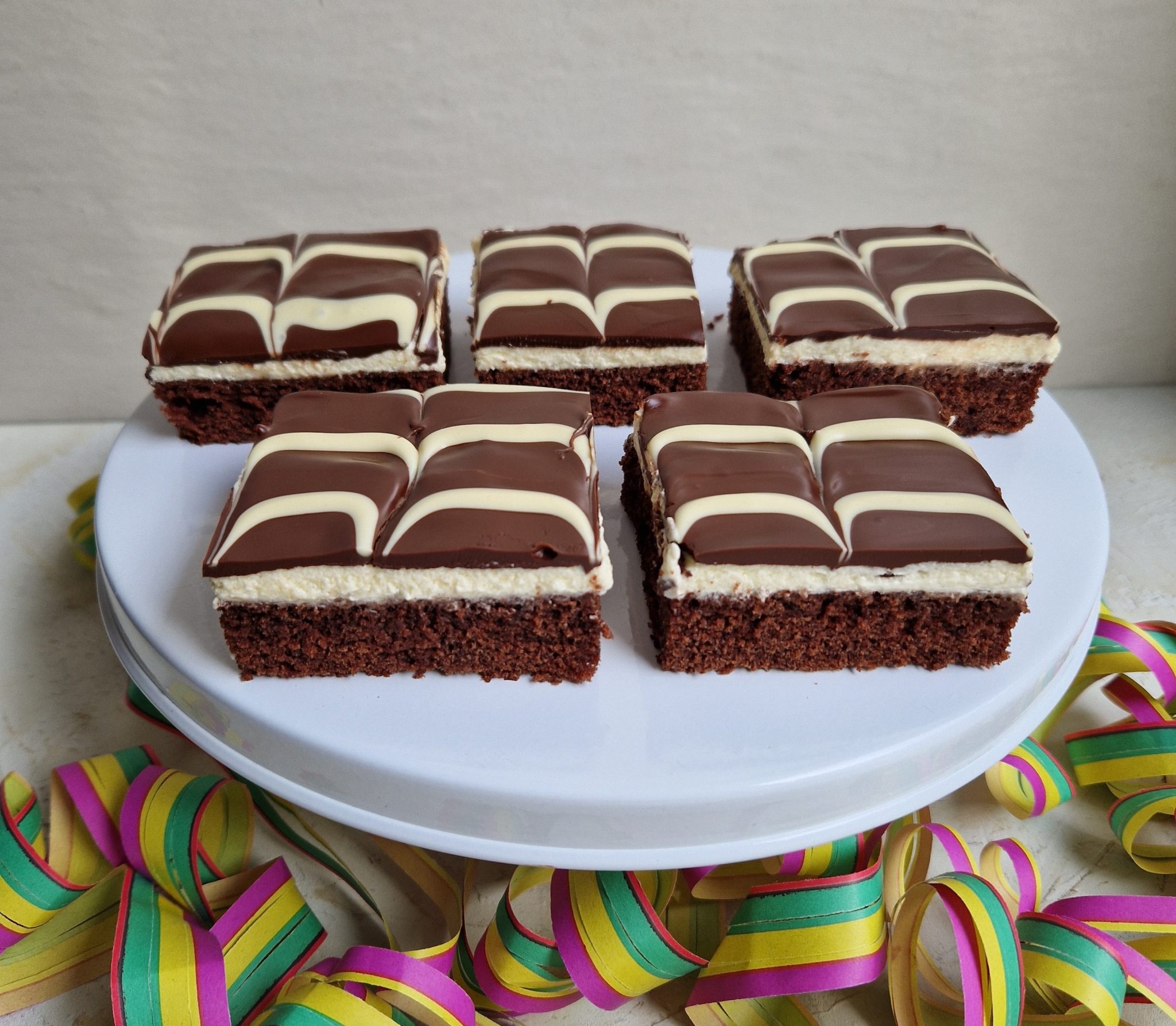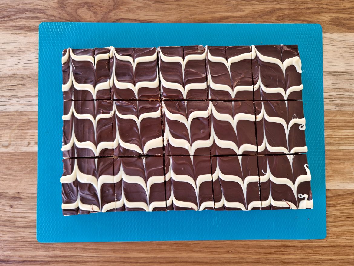 Gluteeniton kinderpiirakka kuorrutetaan sulatetulla gluteenittomalla tummalla suklaalla. Marmorointi tehdään sulatetulla valkosuklaalla.