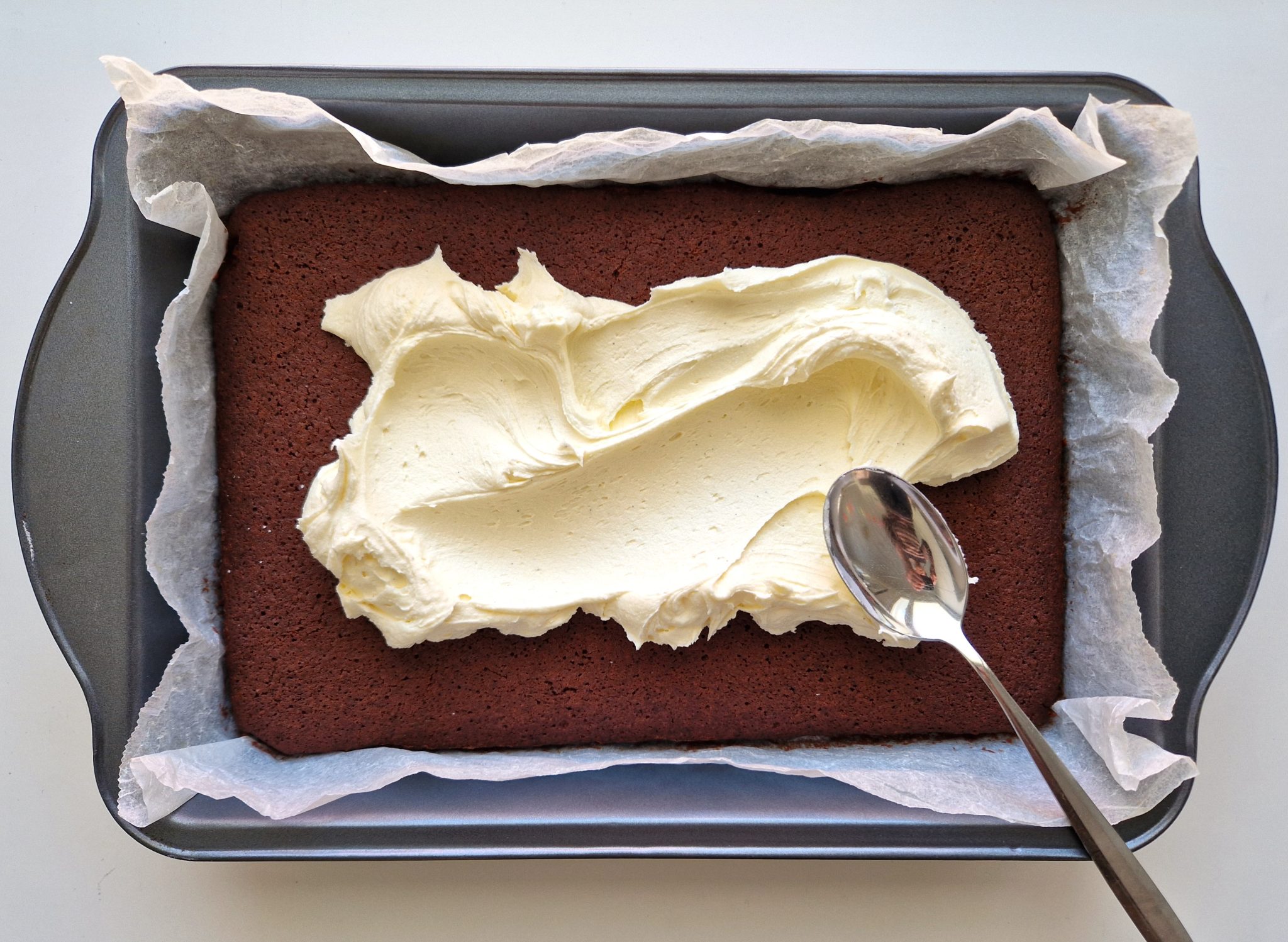 Gluteenittoman suklaapohjan tulee olla täysin jäähtynyt ennen kuin voikreemi levitetään päälle. Jäähtymistä voit nopeuttaa laittamalla kakkupohjan jääkaappiin, kun se on ensin vähän huoneenlämmössä jäähtynyt.