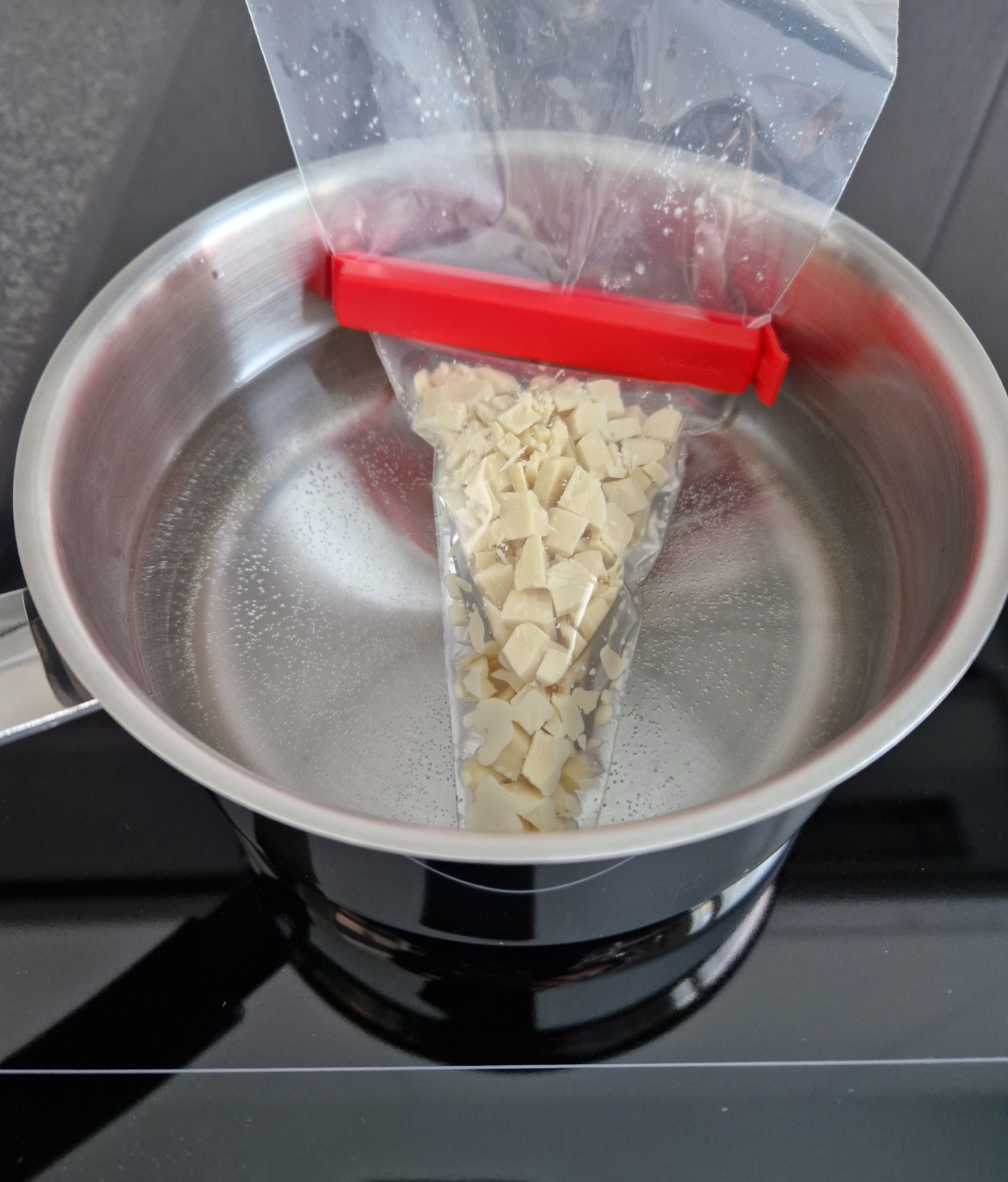 Rouhi valkosuklaa pieniksi paloiksi. Kaada rouhe pieneen muovipussiin ja sulje pussi huolella. Sulata rouhe vesihauteessa.