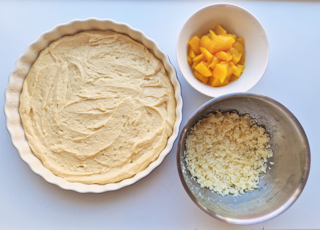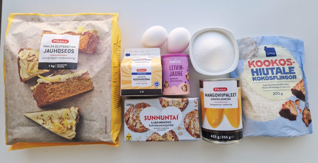 Sokeri ja munat vaahdotetaan, lisätään sulatettu ja hieman jäähtynyt rasva sekä kuivat aineet vuorotellen kerman kanssa. Taikina levitetään piirakkavuoan pohjalle. Piirakkapohjan päälle ripotellaan mangokuutiot. Kookoshiutaleista, sokerista ja sulatetusta rasvasta tehdään kuorrutus mangokuutioiden päälle. Kuorrutukseen on hyvä lisätä ruokalusikallinen gluteenitonta jauhoseosta.