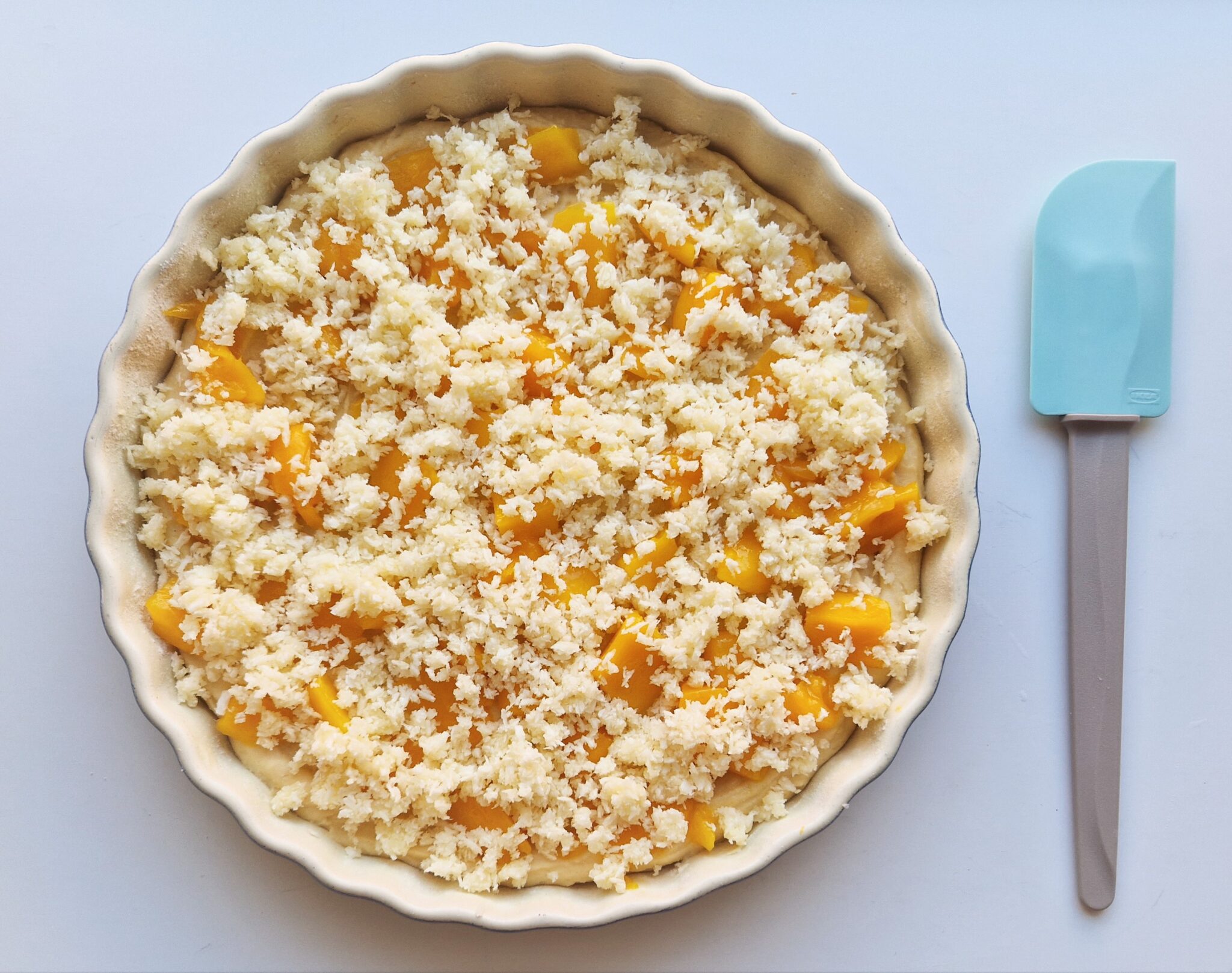 Sokeri ja munat vaahdotetaan, lisätään sulatettu ja hieman jäähtynyt rasva sekä kuivat aineet vuorotellen kerman kanssa. Taikina levitetään piirakkavuoan pohjalle. Piirakkapohjan päälle ripotellaan mangokuutiot. Kookoshiutaleista, sokerista ja sulatetusta rasvasta tehdään kuorrutus mangokuutioiden päälle. Kuorrutukseen on hyvä lisätä ruokalusikallinen gluteenitonta jauhoseosta.