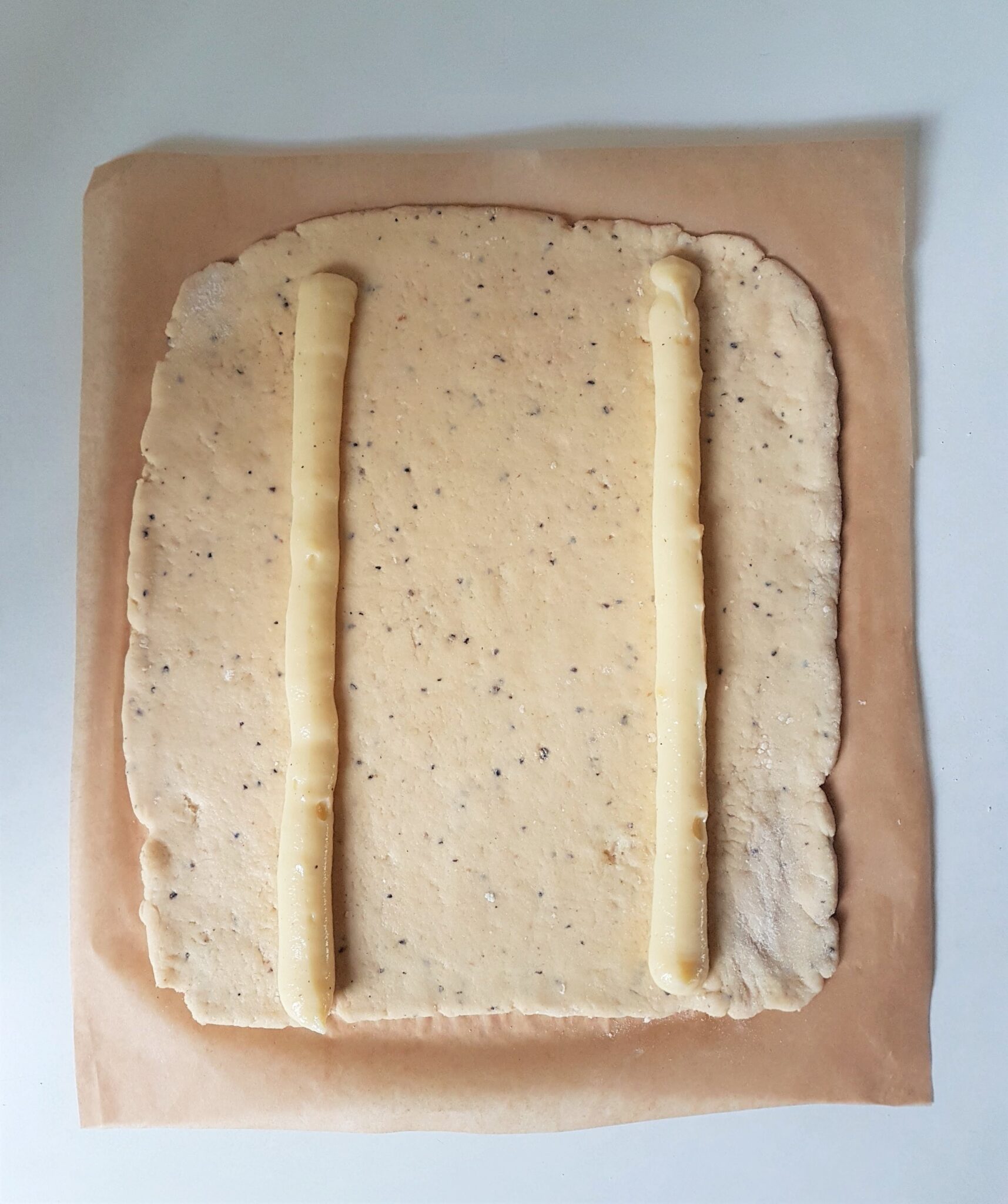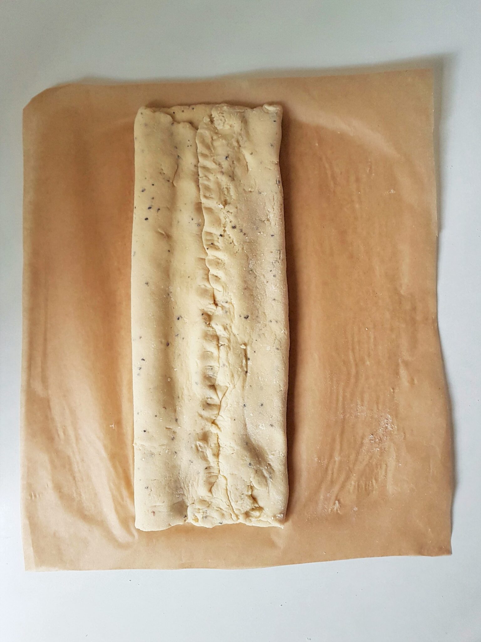 Taikinalevyn päälle pursotetaan vaniljakreemiä molemmille laidoille. Reunat nostetaan kreemipursotusten yli keskelle taikinalevyä leivinpaperia apuna käyttäen. Yritin ensin nostaa reunaa käsin. Reunakaistale ei noussut tarpeeksi pitkälle ja kreemipursotus levisi alla. Toinen reuna meni sitten hienosti leivinpaperin turvin. Oppia ikä kaikki.