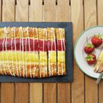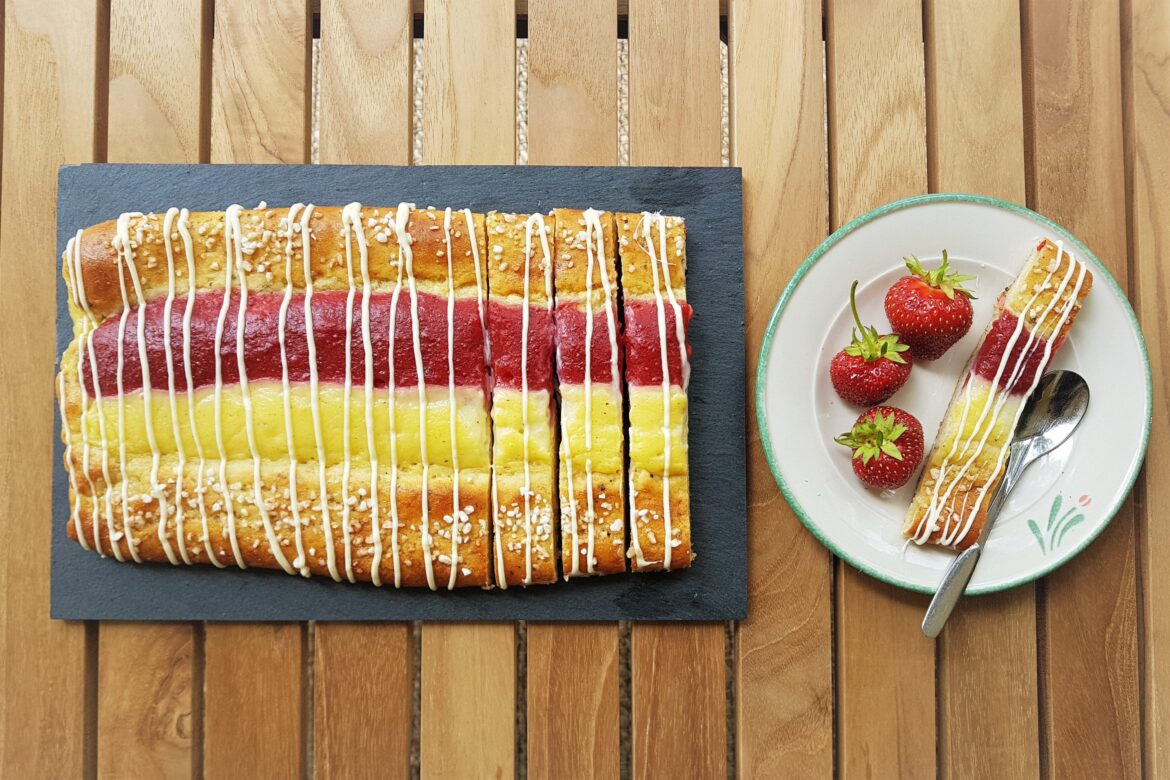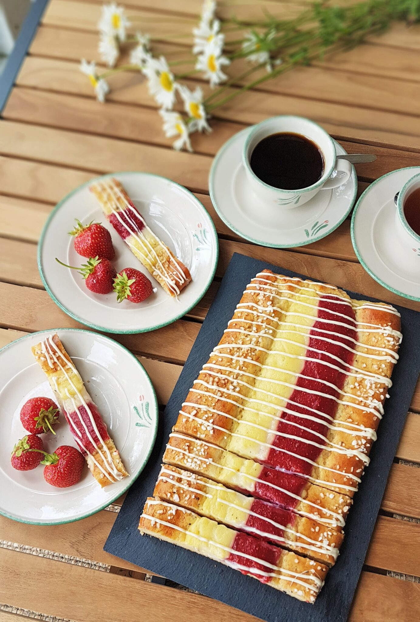 Voitele pitko kananmunalla ja ripottele reunoille raesokeria. Laita mansikkamarmeladi pursotinpussiin. Pursota keskelle vierekkäin mansikkaraita ja vaniljakreemiraita.