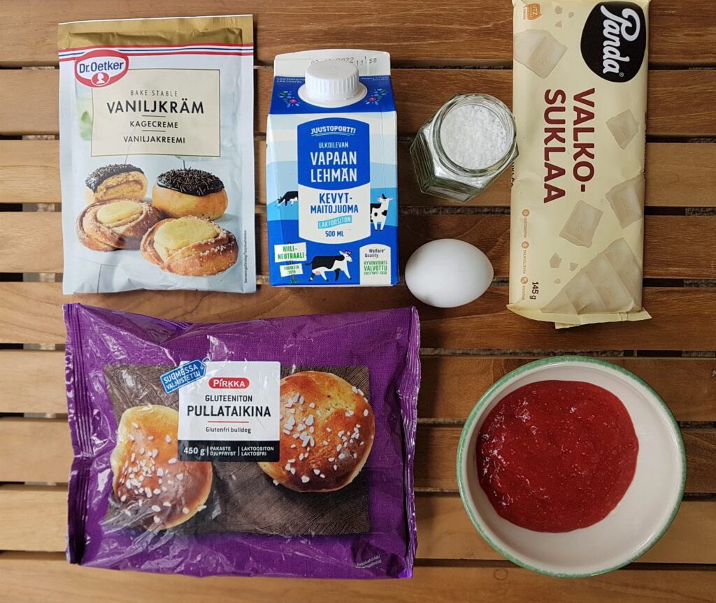 Vaniljakreemitäytteen tein vaniljakreemijauheesta ja mansikkamarmeladin keitin itse. Voit käyttää myös Valion valmista vaniljakreemiä ja kaupan mansikkamarmeladia.