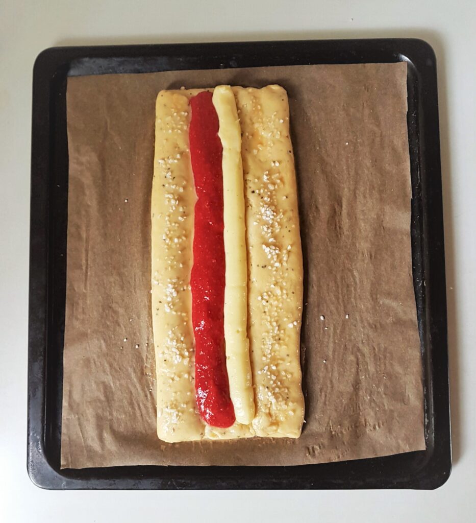 Alusta sulanut pullataikina tasaiseksi gluteenittomalla jauholla jauhotetulla pöydällä, taputtele litteäksi ja kaulitse suorakaiteen muotoiseksi (max 25 cm x 35 cm) levyksi. Siirrä taikinalevy leivinpaperin päälle pellille.