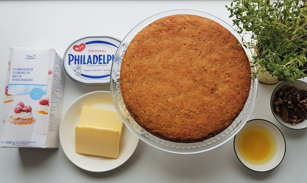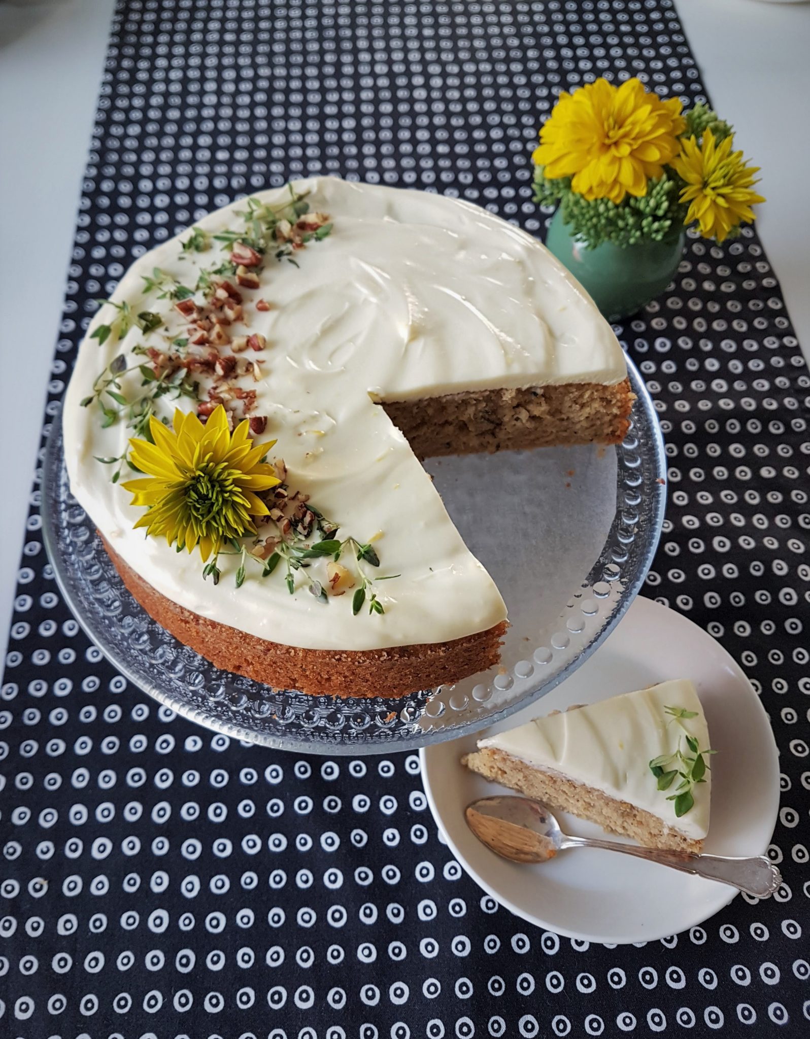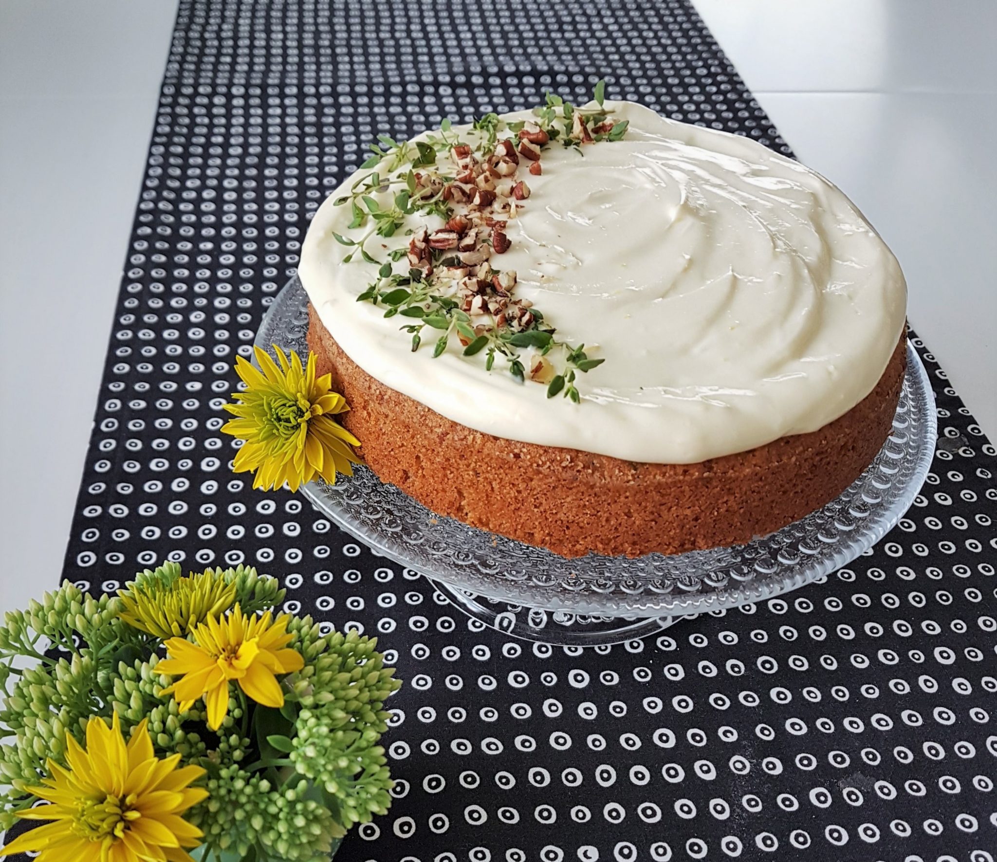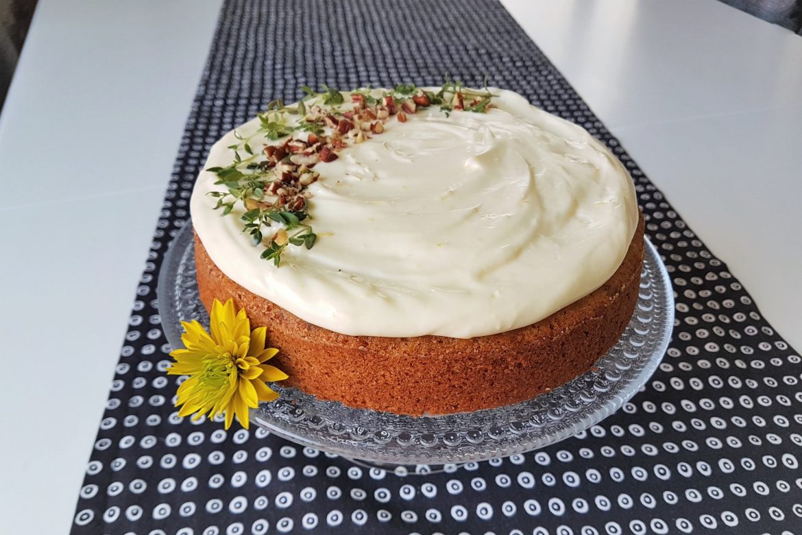 Koristelin kakun tuoreella timjamilla ja pähkinärouheella. Sinä voit koristella omien mieltymystesi mukaisesti.