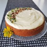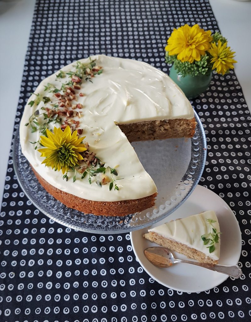Gluteeniton kesäkurpitsakakku onnistui tosi hyvin. Siitä tuli kaunis ja tasainen. Pintakaan ei yhtään repeillyt. Kakun on hyvä antaa tekeytyä yön yli, jolloin se mehevöityy ja rakenne kiinteytyy. Leivoin tämän kakun torstai-iltana ja eilen kuorrutin vähän ennen vieraiden tuloa. Kätevää kun kakun voi tehdä hyvissä ajoin lähes valmiiksi.