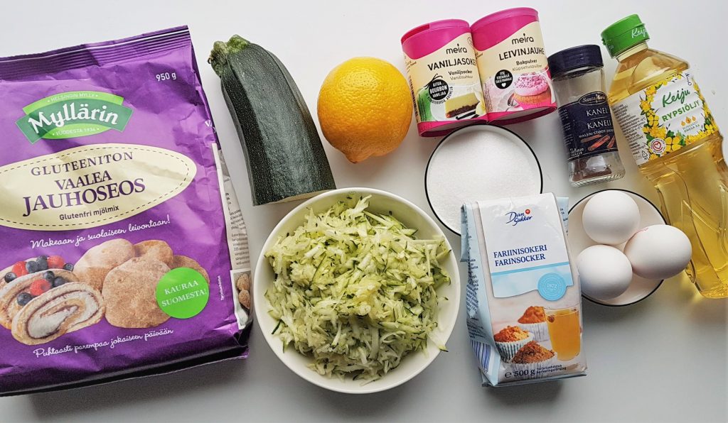 Kesäkurpitsa-aika on nyt parhaimmillaan ja satoa pukkaa. Kesäkurpitsa on miedonmakuinen vihannes, joka sopii moneen käyttöön, niin ruoanvalmistukseen kuin leivontaan. Omia suosikkejani ovat täytetyt kesäkurpitsat ja kesäkurpitsapihvit sekä gluteeniton kesäkurpitsagalette, jonka ohje löytyy täältä blogista. Nyt päätin kokeilla kesäkurpitsaa gluteenittomaan kakkuun. Kesäkurpitsa on maultaan mieto, joten sitä on helppo piilottaa kakkuun. Ei välttämättä edes arvaisi, että tässä kakussa on kesäkurpitsaa.