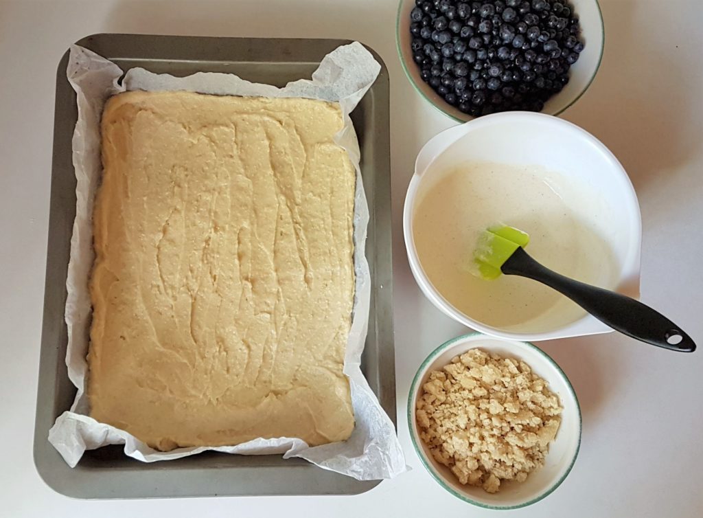 Levitä taikina lusikan tai nuolijan avulla vuoan pohjalle. Ripottele päälle mustikat.
