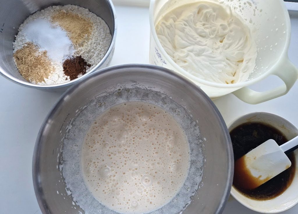 Kuivat aineet sokereita lukuun ottamatta sekoitetaan keskenään. Voi sulatetaan ja siihen lisätään siirappi. Kerma vatkataan vaahdoksi. Samoin kananmunat ja sokeri.