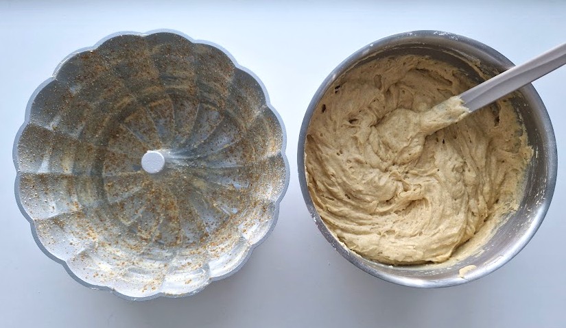 Voitele noin 2,3 litran kakkuvuoka voilla ja jauhota gluteenittomilla korppujauhoilla. Jos sinulla ei ole iso kakkuvuokaa, voit jakaa taikinan kahteen pienempään vuokaan. Sekoita gluteenittoman jauhoseoksen joukkoon mausteet ja sooda.