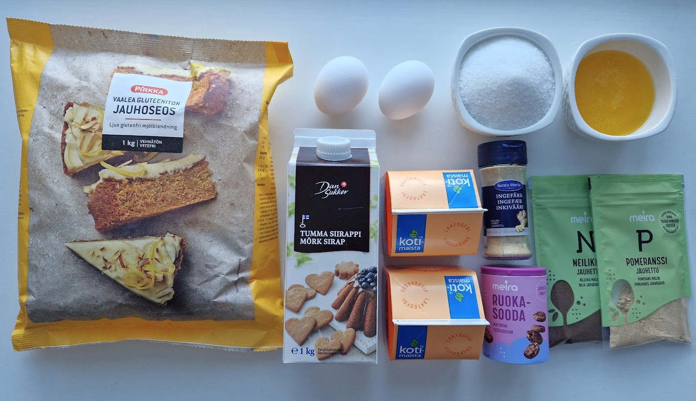 Minna Canthin kakku tuo mieleen vanhan ajan maustekakun. Kakun salaisuus piilee kermavaahdossa, joka tekee kakusta mehevän. Halusin kokeilla kakusta gluteenitonta versiota ja valitsin gluteenittomaksi jauhoseokseksi Pirkan vaalean jauhoseoksen. Mausteiksi tulee vanhan ajan mausteita, kuten neilikkaa, inkivääriä ja pomeranssinkuorta. Voita tarvitaan vain vähän, koska kermaa käytetään runsaasti.