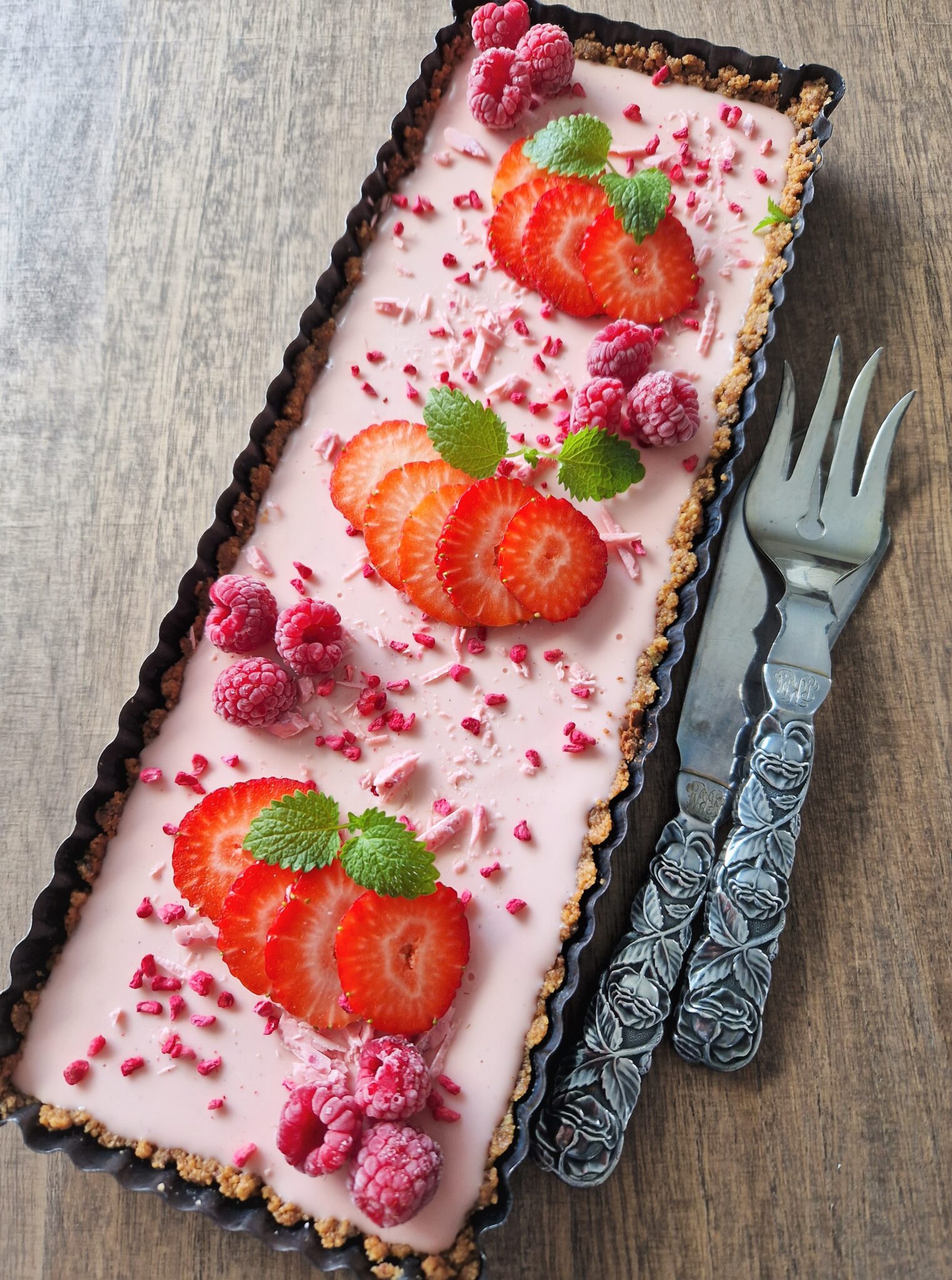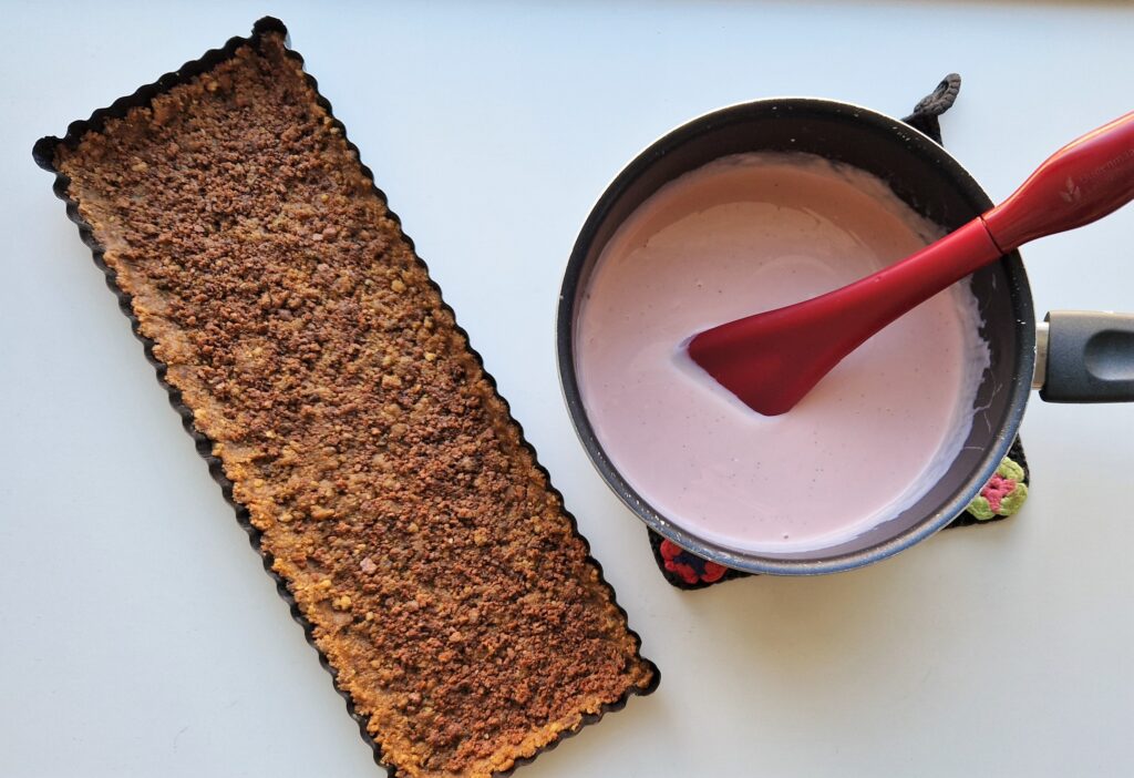 Pannacottatäytteen valmistamiseen tarvitset vain kattilan. Kerma kiehautetaan ja siihen lisätään muut aineet ohjeen mukaisesti. Voit tehdä piirakan myös valkosuklaasta makeislevyn asemasta. Itse halusin kokeilla ihanan pinkinväristä makeislevyä, jossa on vadelmamuruja. Väri kun sopi niin mainiosti naistenpäivään ?