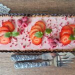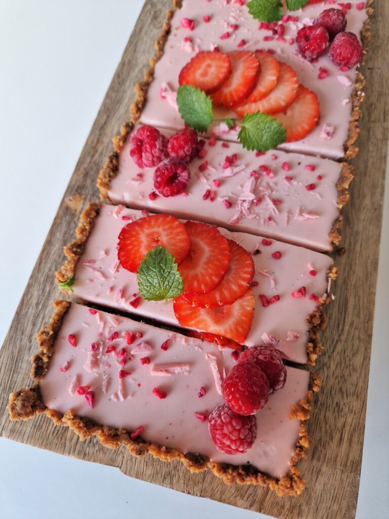 Koristele piirakka mansikoilla ja vadelmilla, makeislevyn muruilla ja kuivatulla vadelmamurulla sekä tuoreella sitruunamelissalla.