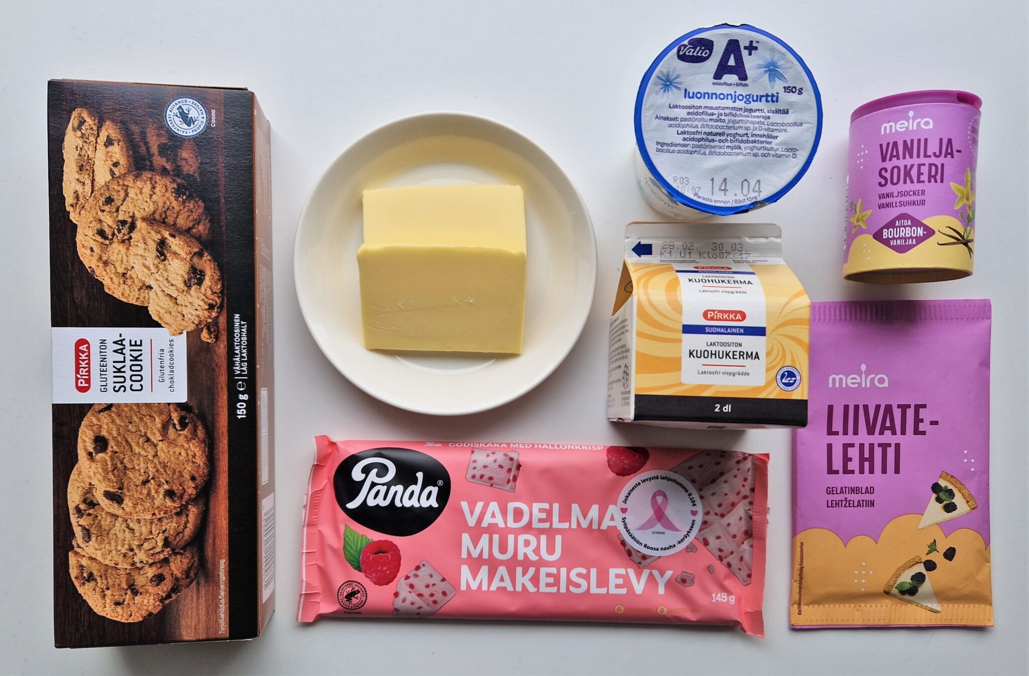 Pannacottapiirakan pohja tehdään gluteenittomista suklaakekseistä. Täytteeseen tulee kuohukermaa, Pandan vadelmamurumakeislevyä ja maustamatonta jogurttia. Maustamiseen käytin vaniljasokeria ja pannacottan hyydyttämiseen pari liivatetta.