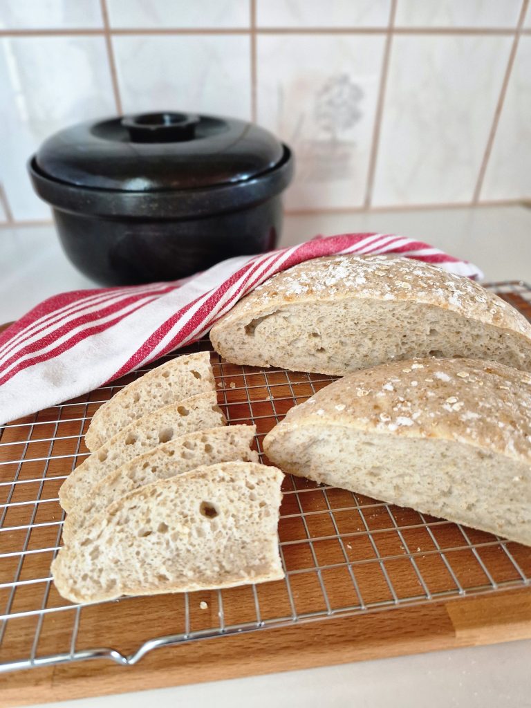 Ota pata pois uunista ja kumoa valmis leipä leivinritilälle jäähtymään. Pataleipä irtoaa helposti padasta. Anna leivän jäähtyä ennen kuin leikkaat maistiaispalan sahateräisellä veitsellä.